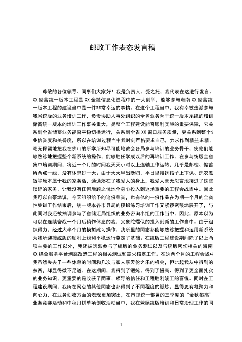尊敬的各位领导、同事们大家好!我是负责人。受之托,我代表在这进行发言。XX储蓄统一版本工程是XX金融信息化进程中的一大创举,能够参与海南XX储蓄统一版本工程的建设当中是一件非常幸运的事情。在这个工程当中,我有幸被选派参与我省统版的业务培训工作,负责协助人事处组织的全省业务骨干统一版本系统的培训。储蓄统一版本的培训工作事关重大,是整个工程建设能否顺利实施的重要保障,它关系到全省储蓄业务能否平稳切换运行,关系到全省XX窗口服务质量,更关系到整个企业信誉度和美誉度,所以在培训过程当中我时刻严格要求自己,力求作到精益求精,毫无保留地把我在佛山的所学所知尽可能地教会各局参与培训的业务骨干,使他们能够熟练地把握整个新系统的操作,能够胜任学成以后的再培训工作。在参与统版全省集中培训期间,将近一个月的时间我天天小时以上连轴工作运转,几乎是邮校、储蓄所两点一线,没有休息过一天。由于天天早出晚归,平日里接送孩子上下课、洗衣煮饭等原本属于我的家务活,通通落在了我爱人的身上,我爱人毫无怨言地接过了这些琐碎的家务,让我没有任何后顾之忧地全身心投入到这场重要的工程会战当中。因此,我可以自豪地说,今天组织给予的这份荣誉,也有他的一份作品在为期一个月的全省性集训工作结束后,统一版本各市县局的模拟练习培训工作又紧锣密鼓地展开了,与此同时我还被抽调参与了省储汇局组织的业务咨询小组的工作当中。因此,原本以为可以在连续奋战一个月后稍作休息的我,又象陀螺似的投入到新的工作当中。由于组织得力,经过大半个月的模拟练习操作,我所里的同志都能够熟练把握和运用新系统,为我所迎接统版的顺利上线和平稳运行奠定了基础。在统版工程建设期间除了以上两项主要的工作以外,我还被选派参与了统版的业务测试以及与统版密切相关的海南XX综合服务平台剥离改造工程的相关测试和需求核定工作。在这两个月的工程会战中我虽然失去了一些休息的时间和几次与家人享天伦之乐的机会,但比起我从中得到的东西,却显得微不足道。在这期间,我得到了锻炼、得到了提高、得到了更全面扎实的业务知识,更重要的是收获了同事、领导的信任和工程胜利竣工的喜悦。同时在工程建设期间,我所在网点的其他同志也都得到了不同程度的锻炼,显得更有凝聚力和向心力,在业务创收方面的表现更加突出,在市邮统一部署的三季度的“金秋攀高”业务竞赛活动和中秋月饼单项创收活动当中,我在兼顾统版培训和日常治理工作的同时,见缝插针地安排部署好各项业务竞赛活动,身先士卒地做好各项工作的表率作用,在全体职工的同努力下,我所的以上两项活动都取得了理想的成绩,非凡是在月饼创收方面我所创收了万元,我个人也取得了近万元的成绩。统版工程虽然暂时告一段落,但是统版的精神将永远激励着我们,激励着全体XX员工更加团结向上、更加忘我拼搏,为XX的美好明天努力奋斗。