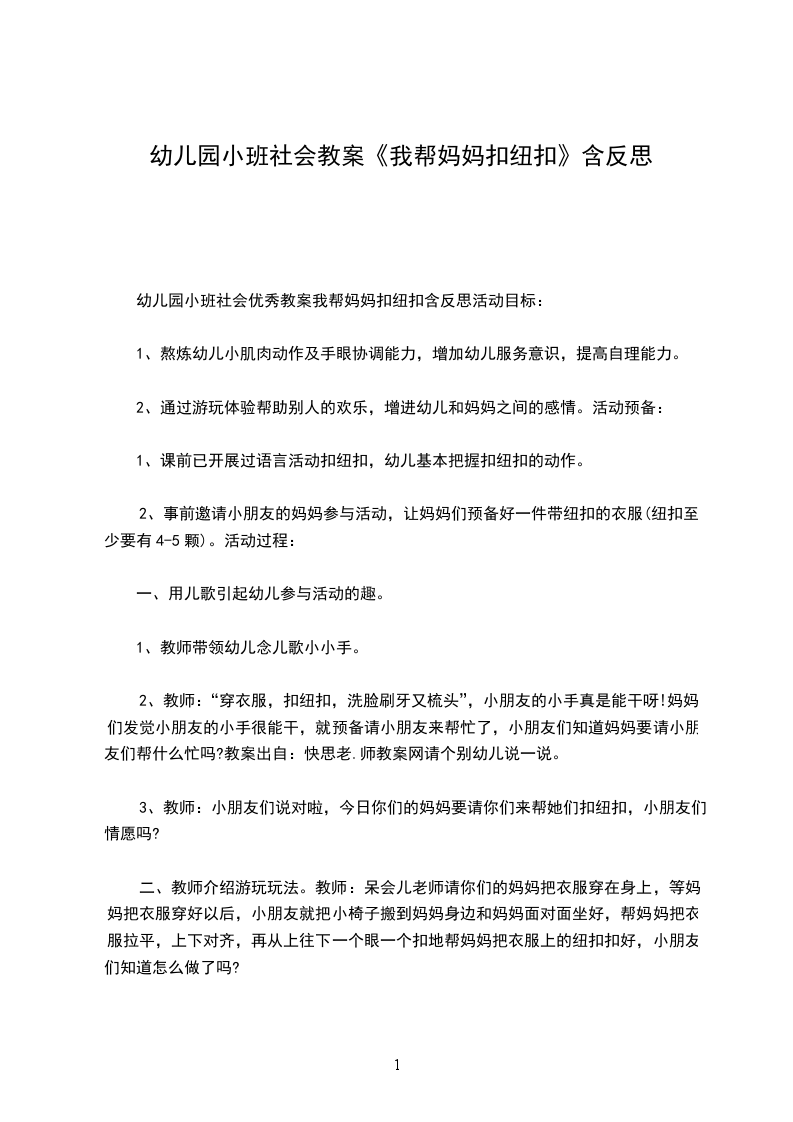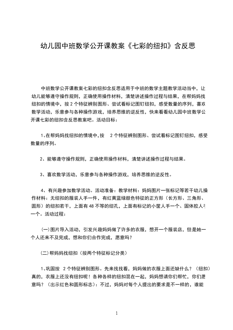 2、帮妈妈钉纽扣(正逆排序)。你们帮妈妈找到纽扣了,她可真高兴!愿意帮她把纽扣订到衣服上吗?从哪里开始钉?怎样订纽扣呢?妈妈说,这个问题有点难,只有听清楚、想明白的宝宝,才会知道。教学反思:幼儿园的数学活动相对于其他活动枯燥、单调,容易使幼儿失去学习兴趣。因为这个时期的幼儿年龄小,逻辑思维尚未发展,所以本次活动中我为幼儿创设了一个可操作的丰富材料的环境,为幼儿创设了一个可选择性、可操作性的空间。使幼儿能独立的操作材料,并大胆的表达自己的想法。幼儿的自主性,选择性,独立性得到了充分的体现。通过一系列的游戏活动,达到了主题总目标预设的要求。小百科:纽扣,在古罗马,最初的纽扣是用来做装饰品的,而系衣服用的是饰针。13世纪,纽扣的作用才与今天相同。那时,人们已懂得在衣服上开扣眼,这种做法大大提高了纽扣的实用价值。16世纪,纽扣得到了普及。