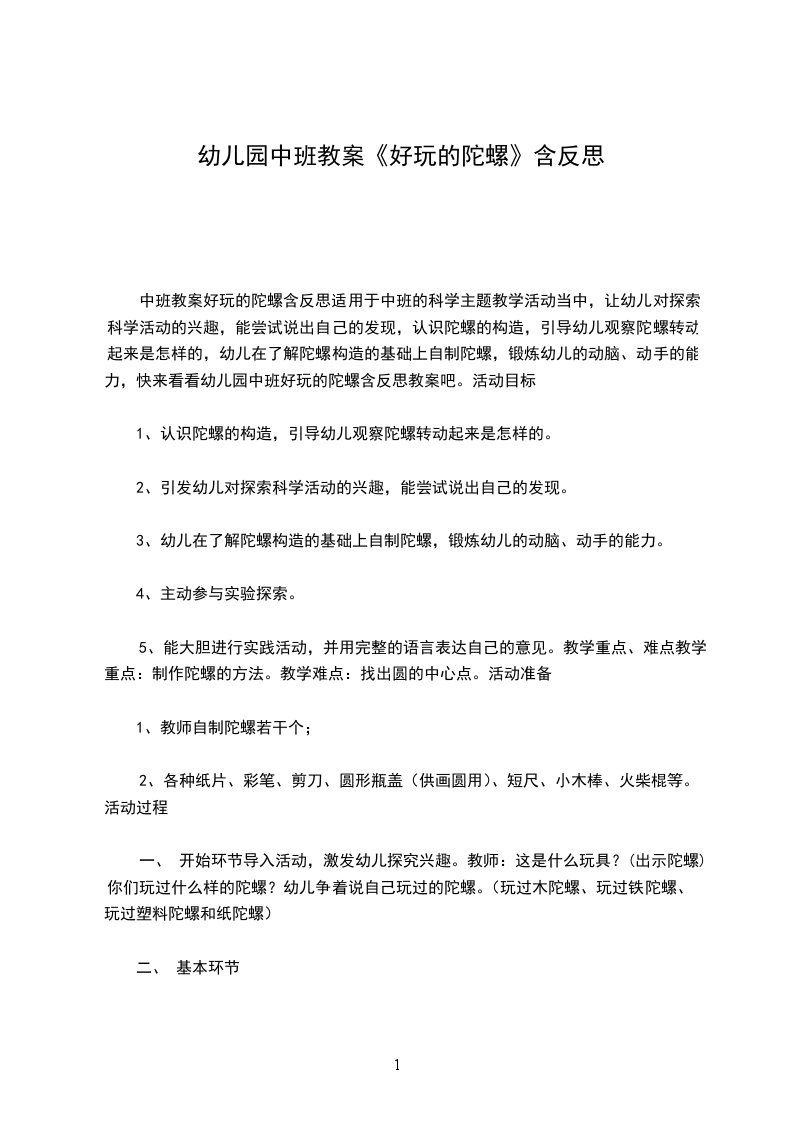 四、 活动延伸今天,小朋友们都懂得了怎样制作陀螺。下面请小朋友再去用其他材料制作陀螺,想一想怎样才能使陀螺转得又稳又快,并选出转动得时间最长的一个准备参加幼儿园组织的转陀螺比赛。教学反思本次活动是孩子们开动脑筋,自己的发现创造,他们很感兴趣。在活动中,幼儿才是真正的活动的主人,老师只是一个引导者、辅助者。整个活动程序的安排,能遵循纲要中组织与实施中的教育性、互动性、针对性的原则,也符合中班幼儿的学习特点和规律。因此,我想通过这样的一个活动,孩子们不仅学会制作陀螺,而且在以后的学习中遇到困难时也会通过动脑思考、动手操作以及与同伴交流等方法来解决问题。小百科:陀螺指的是绕一个支点高速转动的刚体。陀螺是中国民间最早的娱乐工具之一,也作陀罗,闽南语称作“干乐”,北方叫做“冰尜”或“打老牛”。
