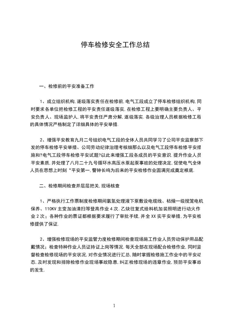 三、存在的问题在本次大检修期间,主要暴露的问题有:1.有个别员工平安意识淡薄,对检修平安工作不够重视,修工程和、检修作业上被动被动采取平安防护举措.2.习惯性违章在检修工作中时有发生,平安意识还需要进一步增强3.本人在专业技术和平安技术治理方面欠缺的知识很多,今后需要全面增强以上存在的平安问题在下一步平安治理工作中还需要改良,我们必须时刻将安全放在首位,增强现场监管,工段各班组也需务必提升平安意识,落实平安责任,把平安防范举措落实到位,杜绝违章,同时增强作业过程的衔接和合作,绝不能马虎行事,否那么,任何一件小事都是一个不XX的因素,都有可能会酿成一场事故灾难.此次大检修的平安圆满完成,是从部门领导到全体电气参检人员的共同努力的结果.也为以后装置运行的平安治理工作积累了经验,今后我部门将继续深挖潜力,勇于探索,查找缺陷,严格治理,争取在今后的平安治理工作中更上一个台阶.郭XX___日
