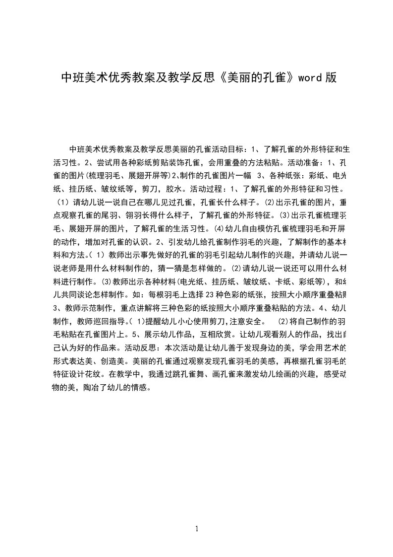 中班美术优秀教案美丽的孔雀含反思适用于中班的美术主题教学活动当中,让幼儿鼓励耐心细致地作画,养成清洁整洁的作画习惯,引导幼儿用各种线条、形状、图案对孔雀的尾部进行分割和装饰,并对称的、有规律地涂色,了解孔雀的外形特征和生活习性,快来看看幼儿园中班美术优秀美丽的孔雀含反思教案吧。活动设计孔雀是孩子们喜欢的鸟类,他们在电视上、图书中见到过孔雀,但对孔雀的生活习性和外形特征了解得还不够全面,因而需要进一步加深幼儿对孔雀的了解。那么通过什么样的方式让孩子能够更直接的加深对孔雀的了解呢绘画和手工制作是深受孩子们喜爱的一种学习方式,因此,我为幼儿准备了各种各样的操作材料,鼓励幼儿发挥想象、大胆创新,提高幼儿的审美能力。活动目标: