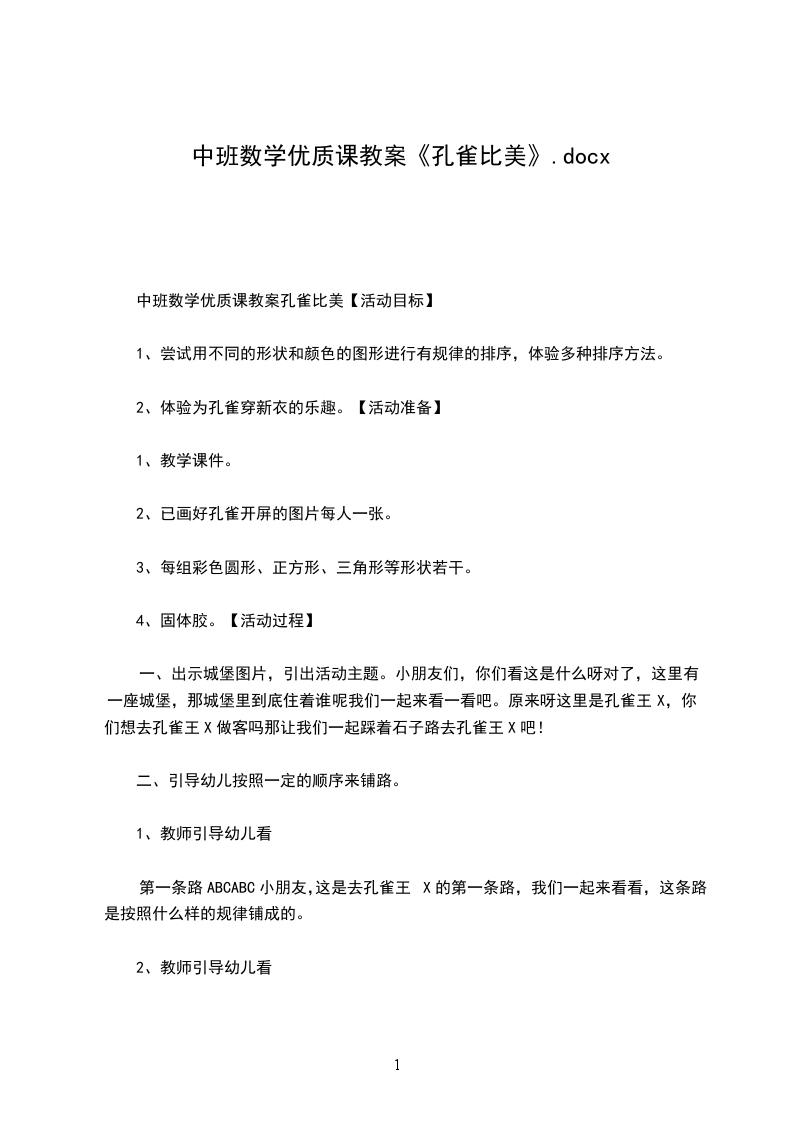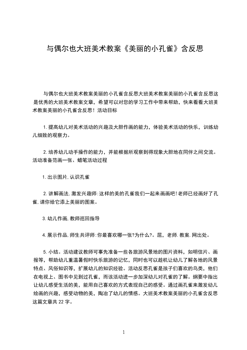 四、 幼儿作画,教师巡回指导。出示未经装饰的孔雀,续编故事:还有很多孔雀也想参加选美比赛,可是他们没有漂亮的衣服,怎么办小朋友,你们愿意帮助小孔雀做新衣服,把他们打扮的漂漂亮亮的去参加比赛吗小朋友在给孔雀打扮时先想好用什么方法来分割孔雀尾部,用什么图案、花纹装饰,选择漂亮的颜色有规律地涂色。鼓励幼儿大胆想象,帮助能力弱的幼儿分割孔雀尾部。结束部分:展示幼儿的作品:比一比,谁的孔雀最美丽。表扬想法独特的幼儿。小朋友,我们把作品带到别的班级,让其他小朋友看一看咱们的孔雀美丽不美丽,好不好跟老师出发吧!(随音乐将幼儿带出活动室)活动反思:在本节活动中幼儿了解了孔雀的外形特征、生活习性,通过绘画和装饰两种方式更深刻的了解了孔雀。在活动中,幼儿兴趣浓厚,积极参与活动,在老师的鼓励下孩子们大胆创新,展现了各种不同风格的作品,充分突出了孩子们个性的张扬,完全把活动的空间留给孩子,让孩子们在活动中展现出自己的风采。小百科:孔雀(英文名称:Peafowls):仅2属3种。孔雀属包括2种,全长达2米以上,其中尾屏约1.5米,为鸡形目体型最大者。头顶翠绿,羽冠蓝绿而呈尖形;尾上覆羽特别长,形成尾屏,鲜艳美丽;真正的尾羽很短,呈黑褐色。