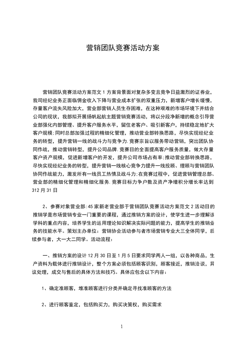 2、参赛对象营业部:45家新老营业部于营销团队竞赛活动方案范文2活动目的推销学是市场营销专业一门重要的课程,通过推销方案的设计,使学生进一步理解该学科的重点内容,培养学生的运用理论知识解决实际问题的能力,提高学生的推销业务的技能水平。策划主办单位:营销协会活动参与者市场营销专业大三全体同学,后续参与者,大一大二同学。活动流程: