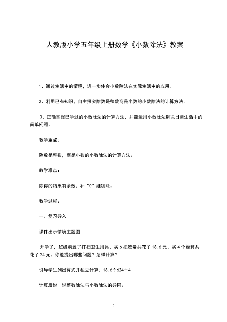 2、板书课题。师:今天我们以整数除法为基础来学习小数除以整数的除法。(板书课题:小数除以整数)