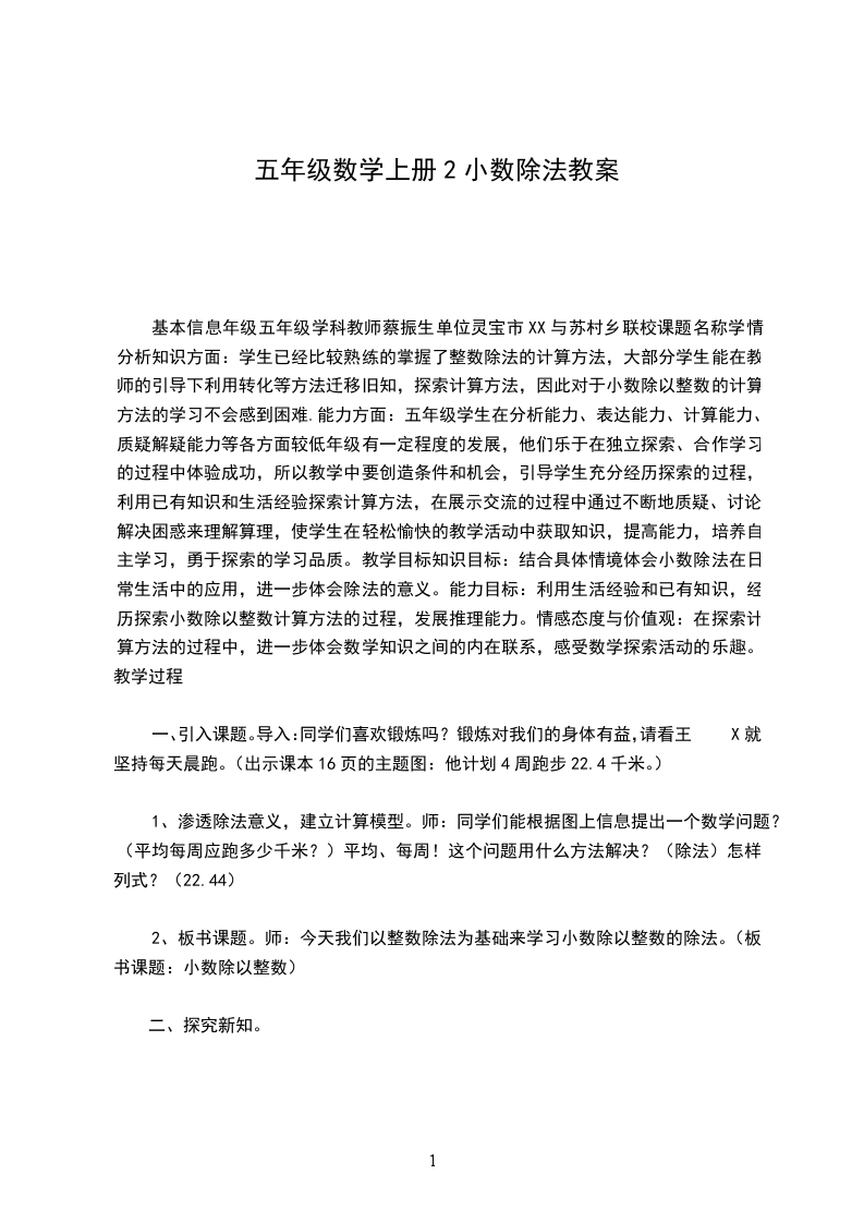 基本信息年级五年级学科教师蔡振生单位灵宝市XX与苏村乡联校课题名称学情分析知识方面:学生已经比较熟练的掌握了整数除法的计算方法,大部分学生能在教师的引导下利用转化等方法迁移旧知,探索计算方法,因此对于小数除以整数的计算方法的学习不会感到困难.能力方面:五年级学生在分析能力、表达能力、计算能力、质疑解疑能力等各方面较低年级有一定程度的发展,他们乐于在独立探索、合作学习的过程中体验成功,所以教学中要创造条件和机会,引导学生充分经历探索的过程,利用已有知识和生活经验探索计算方法,在展示交流的过程中通过不断地质疑、讨论,解决困惑来理解算理,使学生在轻松愉快的教学活动中获取知识,提高能力,培养自主学习,勇于探索的学习品质。教学目标知识目标:结合具体情境体会小数除法在日常生活中的应用,进一步体会除法的意义。能力目标:利用生活经验和已有知识,经历探索小数除以整数计算方法的过程,发展推理能力。情感态度与价值观:在探索计算方法的过程中,进一步体会数学知识之间的内在联系,感受数学探索活动的乐趣。教学过程