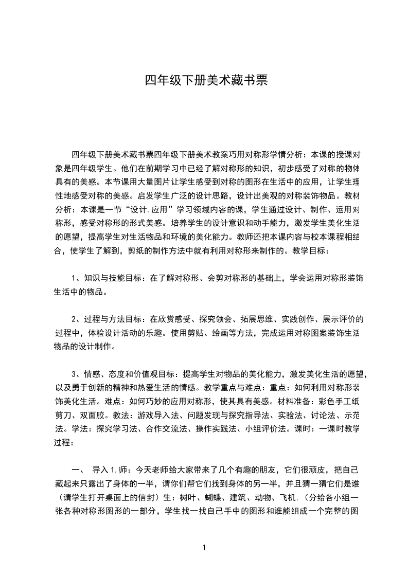 四年级下册美术藏书票四年级下册美术教案巧用对称形学情分析:本课的授课对象是四年级学生。他们在前期学习中已经了解对称形的知识,初步感受了对称的物体具有的美感。本节课用大量图片让学生感受到对称的图形在生活中的应用,让学生理性地感受对称的美感。启发学生广泛的设计思路,设计出美观的对称装饰物品。教材分析:本课是一节“设计.应用”学习领域内容的课,学生通过设计、制作、运用对称形,感受对称形的形式美感。培养学生的设计意识和动手能力,激发学生美化生活的愿望,提高学生对生活物品和环境的美化能力。教师还把本课内容与校本课程相结合,使学生了解到,剪纸的制作方法中就有利用对称形来制作的。教学目标:
