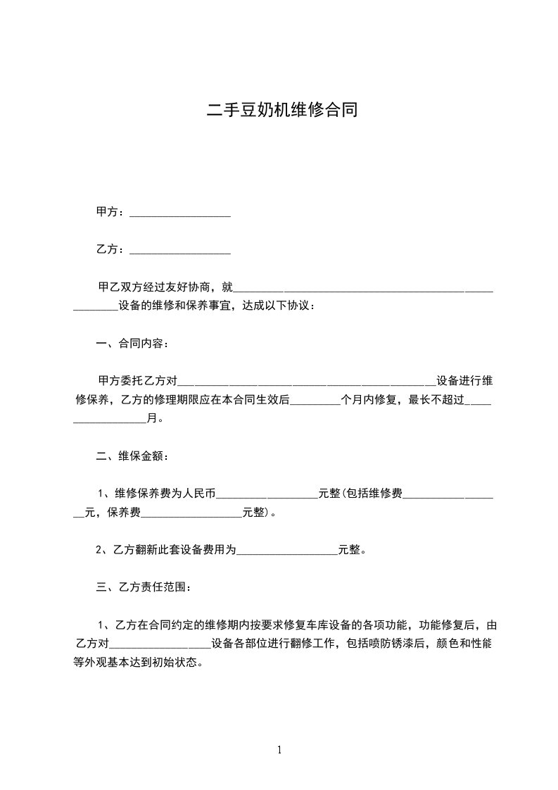 为了防止甲方因__________________设备维修保养不及时而导致不能正常工作造成的产财损失,乙方特此接受甲方委托。乙方为保证甲方设备的正常使用,对甲方的合同设备进行维修保养服务。为保护甲乙双方的合法权益,根据《中华人民共和国民法典》,甲乙双方遵循公平原则友好协商签订本合同。初次签合同前,设备应正常运转情况下,方可签订合同。合同内容如下: