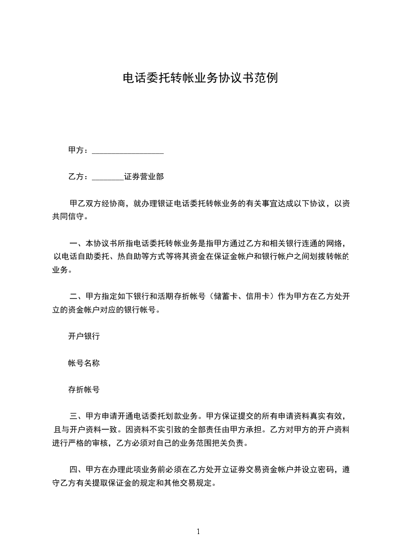 一、本协议书所指电话委托转帐业务是指甲方通过乙方和相关银行连通的网络,以电话自助委托、热自助等方式等将其资金在保证金账户和银行账户之间划拨转帐的业务。