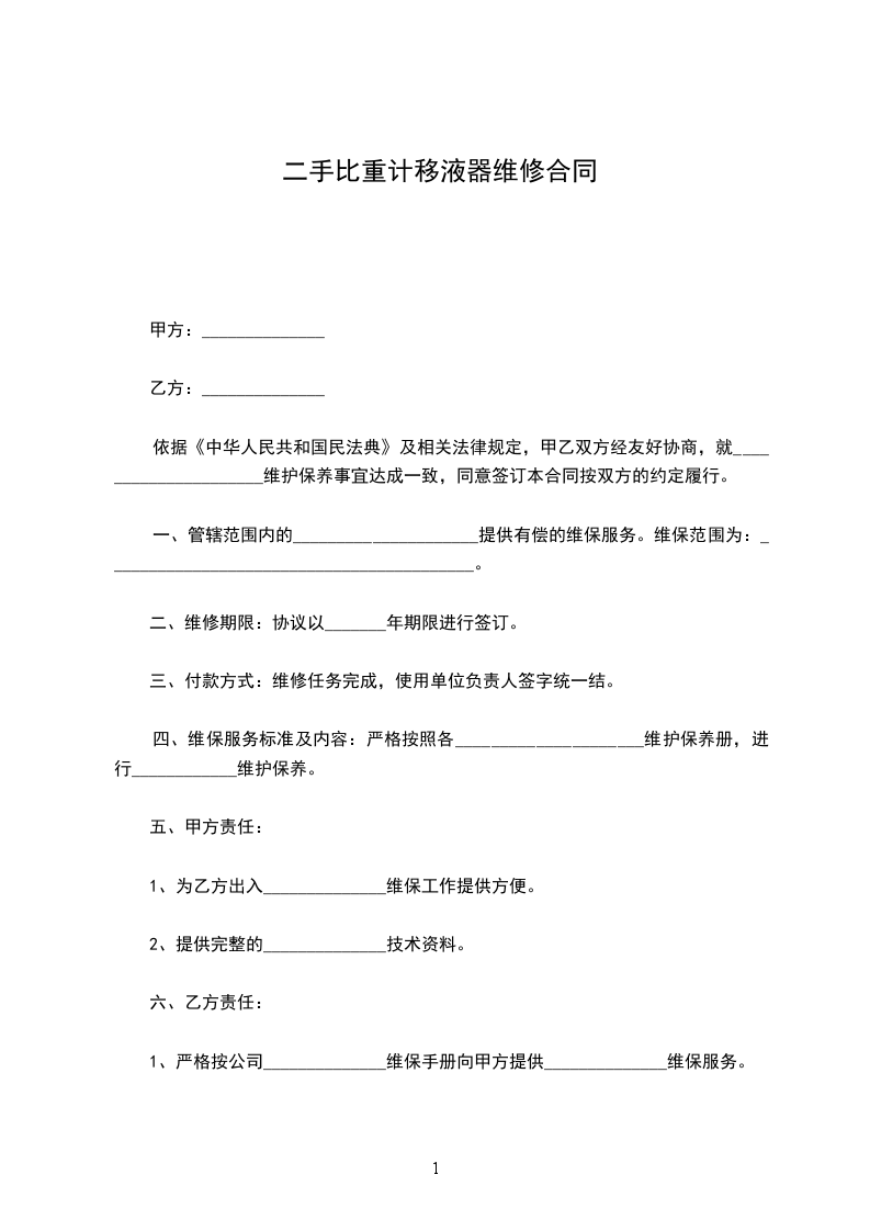 依据《中华人民共和国民法典》及相关法律规定,甲乙双方经友好协商,就_____________________维护保养事宜达成一致,同意签订本合同按双方的约定履行。