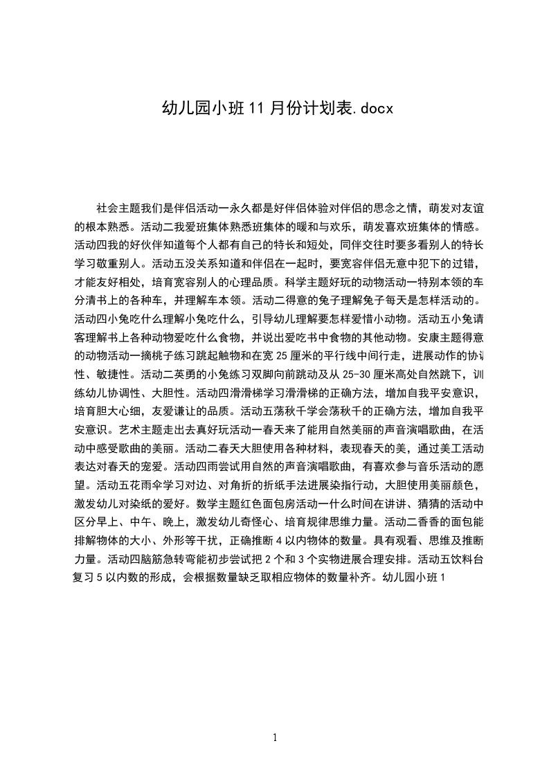 社会主题我们是伴侣活动一永久都是好伴侣体验对伴侣的思念之情,萌发对友谊的根本熟悉。活动二我爱班集体熟悉班集体的暖和与欢乐,萌发喜欢班集体的情感。活动四我的好伙伴知道每个人都有自己的特长和短处,同伴交往时要多看别人的特长,学习敬重别人。活动五没关系知道和伴侣在一起时,要宽容伴侣无意中犯下的过错,才能友好相处,培育宽容别人的心理品质。科学主题好玩的动物活动一特别本领的车分清书上的各种车,并理解车本领。活动二得意的兔子理解兔子每天是怎样活动的。活动四小兔吃什么理解小兔吃什么,引导幼儿理解要怎样爱惜小动物。活动五小兔请客理解书上各种动物爱吃什么食物,并说出爱吃书中食物的其他动物。安康主题得意的动物活动一摘桃子练习跳起触物和在宽25厘米的平行线中间行走,进展动作的协调性、敏捷性。活动二英勇的小兔练习双脚向前跳动及从25-30厘米高处自然跳下,训练幼儿协调性、大胆性。活动四滑滑梯学习滑滑梯的正确方法,增加自我平安意识,培育胆大心细,友爱谦让的品质。活动五荡秋千学会荡秋千的正确方法,增加自我平安意识。艺术主题走出去真好玩活动一春天来了能用自然美丽的声音演唱歌曲,在活动中感受歌曲的美丽。活动二春天大胆使用各种材料,表现春天的美,通过美工活动表达对春天的宠爱。活动四雨尝试用自然的声音演唱歌曲,有喜欢参与音乐活动的愿望。活动五花雨伞学习对边、对角折的折纸手法进展染指行动,大胆使用美丽颜色,激发幼儿对染纸的爱好。数学主题红色面包房活动一什么时间在讲讲、猜猜的活动中区分早上、中午、晚上,激发幼儿奇怪心、培育规律思维力量。活动二香香的面包能排解物体的大小、外形等干扰,正确推断4以内物体的数量。具有观看、思维及推断力量。活动四脑筋急转弯能初步尝试把2个和3个实物进展合理安排。活动五饮料台复习5以内数的形成,会根据数量缺乏取相应物体的数量补齐。幼儿园小班1