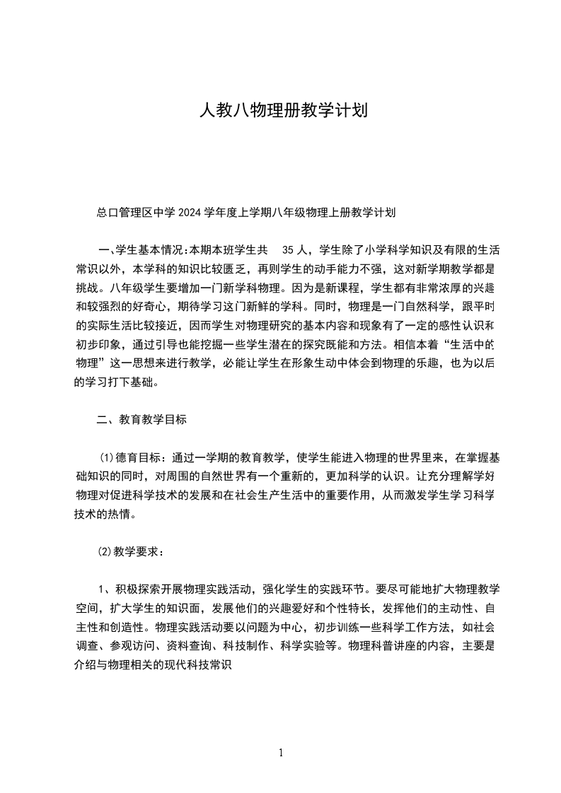 总口管理区中学2024学年度上学期八年级物理上册教学计划