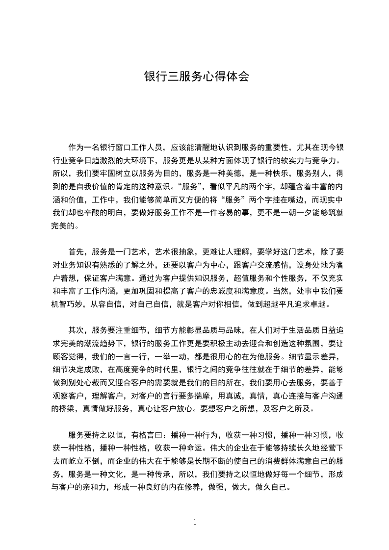 三、学问是提高服务力量的顽强保证 人们往往习惯 把服务理解为看法,即看法好就等 服务好。其实不然,服务有其更深刻的内涵,服务者必需具有良好的专业学问,遵纪遵守法律的合规意识和善解心愿、精准、快捷、高效的服务技能,而学问是提高服务力量的顽强保证。 良好的专业学问来源 平常的学习和日常的实践。我特别专注 将所学学问与实际工作的结合运用,在工作中学,在工作中提高,在工作中体会。抱着“博学、审问、慎思、明辩、笃行”的原则,做到在工作中多听、多学、多做、多想。听师傅、领导的教导;学师傅处理业务时的操作技术;做业务时要格外谨慎,留意简单犯错的环节和详情,遇到难点和问题时立刻向师傅请教,准时为客户解决,做到熟能生巧;做完业务后马上再想一想为什么这么做,有没有更好的方法,这样就会做细做精,越做越好。在学习中提高理论水平,在实践中积累实际阅历。怀着求新、求变、求学的上进心理,做到干一行、爱一行、钻一行、精一行。我行地处家具市场,家具老板习惯 以现金结算往来,不能体会到大额现金的不性,而且有悖 人行关 加强大额现金管理的有关规定。 是,我利用所学学问准时向他们推介本地支付可选择开取本票,异地支付可选择异地电汇,便利又快捷,同时尽量开立单位结算账户办理相关结算往来。银行的工作在时时改变着,每天都有新的东西消失、新的状况发生,这都需要我们跟紧形势努力转变自己,更好地规划自己的目标,学习新的学问,把握新的技巧,适应不断改变的工作目标,提高服务质量,满足客户的需求。客户的需求对我既是一种压力,也是一种动力。我利用业余时间参与了专业专升本的学习,并 _年顺当拿到了会计专业本科学历,用学问改善和武装自己,为服务技能的提高供应了顽强保证。 银行客服工作总结2 初次来到合作银行金桥支行,同事们给我的第一感觉是仔细和劳碌,我来到这感到很业余,由 我学的不是金融,对 这行的一切感到空空的,我知道一切将要从零开头。 工作小而言之是个饭碗,大而言之是份信仰。每个人都有每个人的世界观职业观,一分合适的工作对每个人都很重要,我非常幸运能走进合作银行,走进这个团体,我想在这里就是给人补充血液的地方,我想在以后的工作中肯定有很多东西向前辈们学习讨教,不对的地方敬请批判指正! 我所在的岗位是前线临柜,是接触客户的第一岗位,我的一言一行都代表着本行的形象,所以在工作中我不能有一思的马虎与放松,银行就是属 服务行业。因此这样的工作环境就迫使我自己不断的提示自己要在工作中仔细仔细再仔细。在工作中,必需是忠 职守,尽力而为的。工作不仅要做得“好”、“快”还要“合法”、“合规”,不仅要懂得“亡羊补牢”,重要的还在 “有备无患”。如何提高工作效率,更好地完成工作要求,是我现在常常思索的问题。 我非常感谢同事给我的关心和关怀,从点钞到珠算,从支票到汇票,从坐在师傅后面到自己临柜,从不熟识业务到认识每个操作代码,每一个角落都有你们的悉心关心,每个点点滴滴都有你们的耐烦指导。我知道我的每一次差错都给你们带来额外的麻烦,我的每一次失误都给你们带来不必要的损失,是你们给了我机会和信念,在此鞠躬谢过,请信任:我肯定会用最短的时间学好本事和大家一同并肩工作。 我同样感谢各位领导对我的信任,你们平易近人的看法和虚心谨慎的作风让我有机会零距离向你们学习,感谢你们对我工作中点点马虎的包涵,今后我肯定细心再细心,我感觉:在银行干活比干针线活还细才行。 我为自己制定了新的目标,那就是要加紧学习,更好的改善自己,以饱满的精神状态来迎接新时期的挑战。我想今年会有更多的机会和竞争在等着我,我心里在暗暗的为自己鼓劲。要在竞争中站稳脚步。踏踏实实,目光不能只限 自身四周的小圈子,要着眼 大局,着眼 今后的进展。我也会向其他同志学习,取长补短,相互沟通好的工作阅历,共同进步。为今年自己的业绩行里的业绩划出一个圆满的句号 争取更好的工作成绩。我信任我肯定会做的更好! 银行客服工作总结3 时代在变、环境在变,银行的工作也在时时改变着,每一天都有新的东西消失、新的状况发生,这都需要我们跟紧形势努力转变自我,更好地规划自我的职业生涯,学习新的学问,把握新的技巧,适应四周环境的改变,作为服务行业,商业银行除了出售自我的有形产品外,还要出售无形产品服务,银行的各项经营目标需要透过带给优质的服务来实现。银行的服务工作需要我们不仅仅要有对工作的满腔热忱,更要有一颗追求完善的心。其实客户,就是我们每一天都要应对的“考官”。 作为一名银行柜台工作人员,就应能糊涂地认识到服务的重要性,尤其在现今银行业竞争日趋激烈的大环境下,服务更是从某种方面体现了银行的软实力与竞争力。“服务”,看似平凡的两个字,却蕴含着丰富的内涵和价值,工作中,我们能够简洁而便利的将“服务”两个字挂在嘴边,而现实中,我们却也心酸的明白,要做好服务工作不是一件简单的事,更不是一朝一夕能够筑就完善的。 不一样客户在不一样状况下的不一样需求,并学会透过察言观色的方法来辨别这些需求,并依据客户类型的差异,为不一样类型的客户带给不一样类型的服务。服务要注重详情,要让顾客觉得,我们的一言一行