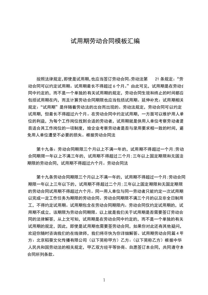 第十九条劳动合同期限三个月以上不满一年的,试用期不得超过一个月;劳动合同期限一年以上三年以下的,试用期不得超过二个月;三年以上固定期限和无固定期限的劳动合同试用期不得超过六个月。同一用人单位与同一劳动者只能约定一次试用期。以完成一定工作任务为期限的劳动合同、劳动合同期限不满三个月的以及非全日制用工,不得约定试用期。试用期包含在劳动合同期限内。劳动合同仅约定试用期的,试用期不成立,该期限为劳动合同期限。以上就是我们关于试用期是否需要签订劳动合同的法律解答,从上文可知,试用期是在劳动合同中约定的,而不是一个单独的有关试用期的规定,因此,即使是试用期也需要签劳动合同,如果你对此还有其他疑问,欢迎你随时咨询我们的在线律师,我们将尽快为你详细解答。试用期劳动合同篇4甲方:北京稻葵文化传播有限公司(以下简称甲方)乙方:(以下简称乙方)根据中华人民共和国劳动法的相关规定,甲乙双方经平等协商、自愿签订本合同,共同遵守本合同所列条款。