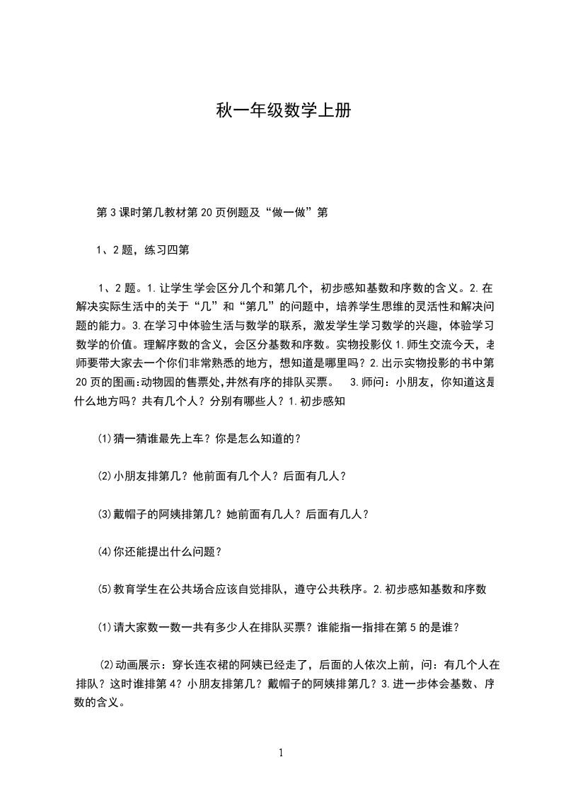 1、2题。1.让学生学会区分几个和第几个,初步感知基数和序数的含义。2.在解决实际生活中的关于“几”和“第几”的问题中,培养学生思维的灵活性和解决问题的能力。3.在学习中体验生活与数学的联系,激发学生学习数学的兴趣,体验学习数学的价值。理解序数的含义,会区分基数和序数。实物投影仪1.师生交流今天,老师要带大家去一个你们非常熟悉的地方,想知道是哪里吗?2.出示实物投影的书中第20页的图画:动物园的售票处,井然有序的排队买票。3.师问:小朋友,你知道这是什么地方吗?共有几个人?分别有哪些人?1.初步感知
