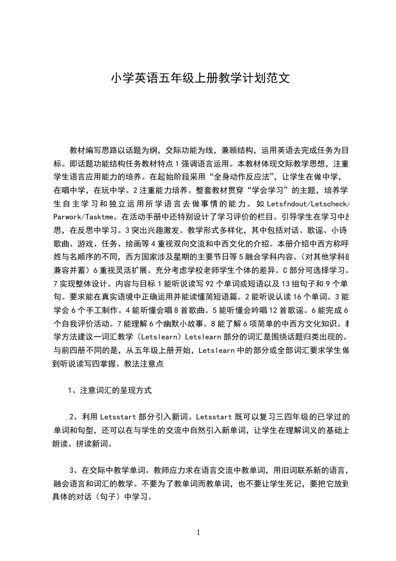 教材编写思路以话题为纲,交际功能为线,兼顾结构,运用英语去完成任务为目标。即话题功能结构任务教材特点1强调语言运用。本教材体现交际教学思想,注重学生语言应用能力的培养。在起始阶段采用“全身动作反应法”,让学生在做中学,在唱中学,在玩中学。2注重能力培养。整套教材贯穿“学会学习”的主题,培养学生自主学习和独立运用所学语言去做事情的能力。如Letsfndout/Letscheck/Parwork/Tasktme。在活动手册中还特别设计了学习评价的栏目。引导学生在学习中反思,在反思中学习。3突出兴趣激发。教学形式多样化,其中包括对话、歌谣、小诗、歌曲、游戏、任务、绘画等4重视双向交流和中西文化的介绍。本册介绍中西方称呼姓与名顺序的不同,西方国家涉及星期的主要节日等5融合学科内容。(对其他学科的兼容并蓄)6重视灵活扩展。充分考虑学校老师学生个体的差异。C部分可选择学习。7实现整体设计。内容与目标1能听说读写92个单词或短语以及13组句子和9个单句。要求能在真实语境中正确运用并能读懂简短语篇。2能听说认读16个单词。3能学会6个手工制作。4能听懂会唱8首歌曲。5能听懂会吟唱12首歌谣。6能完成6个自我评价活动。7能理解6个幽默小故事。8能了解6项简单的中西方文化知识。教学方法建议一词汇教学(Letslearn)Letslearn部分的词汇是围绕话题归类出现的。与前四册不同的是,从五年级上册开始,Letslearn中的部分或全部词汇要求学生做到听说读写四掌握。教法注意点