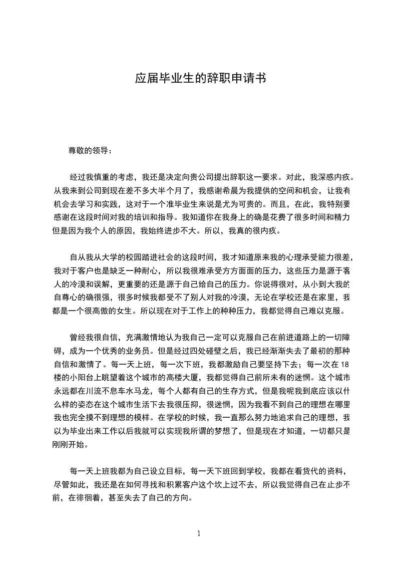 经过我慎重的考虑,我还是决定向贵公司提出辞职这一要求。对此,我深感内疚。从我来到公司到现在差不多大半个月了,我感谢希晨为我提供的空间和机会,让我有机会去学习和实践,这对于一个准毕业生来说是尤为可贵的。而且,在此,我特别要感谢在这段时间对我的培训和指导。我知道你在我身上的确是花费了很多时间和精力,但是因为我个人的原因,我始终进步不大。所以,我真的很内疚。
