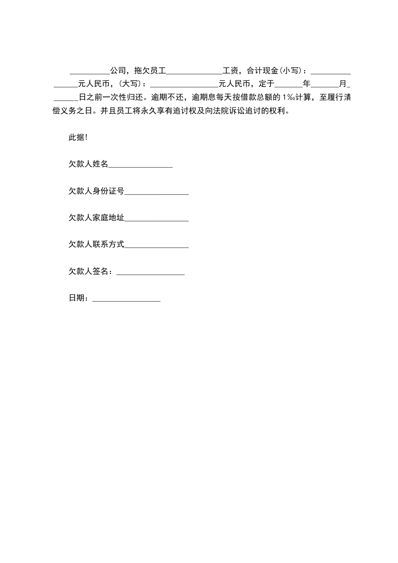 __________公司,拖欠员工______________工资,合计现金(小写):________________元人民币,(大写):_________________元人民币,定于_______年_______月_______日之前一次性归还。逾期不还,逾期息每天按借款总额的1‰计算,至履行清偿义务之日。并且员工将永久享有追讨权及向法院诉讼追讨的权利。