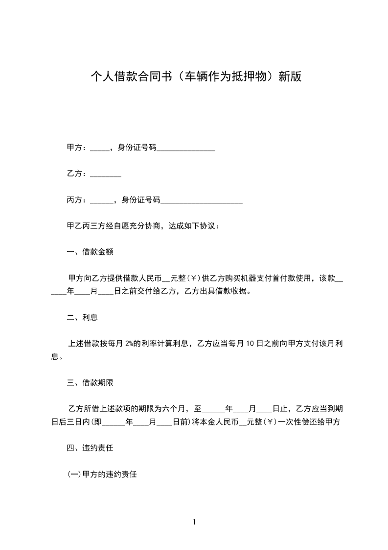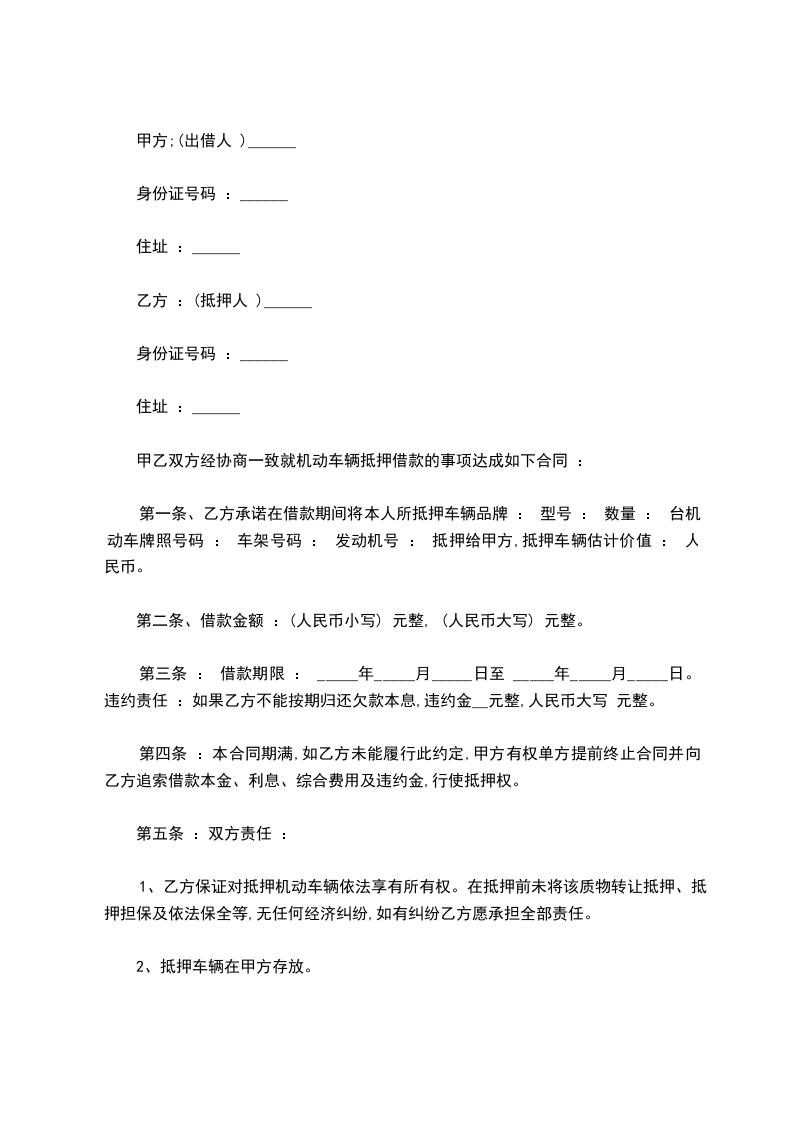 名称:_____________壹辆,排量:_____________,颜色:_____________,车牌号为:_________________,发动机号为:________________.上述抵押的车辆为甲方所有。