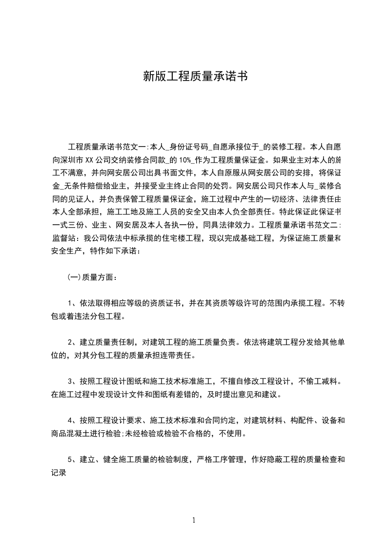 工程质量承诺书范文一:本人_身份证号码_自愿承接位于_的装修工程。本人自愿向深圳市XX公司交纳装修合同款_的10%_作为工程质量保证金。如果业主对本人的施工不满意,并向网安居公司出具书面文件,本人自原服从网安居公司的安排,将保证金_无条件赔偿给业主,并接受业主终止合同的处罚。网安居公司只作本人与_装修合同的见证人,并负责保管工程质量保证金,施工过程中产生的一切经济、法律责任由本人全部承担,施工工地及施工人员的安全又由本人负全部责任。特此保证此保证书一式三份、业主、网安居及本人各执一份,同具法律效力。工程质量承诺书范文二:监督站:我公司依法中标承揽的住宅楼工程,现以完成基础工程,为保证施工质量和安全生产,特作如下承诺: