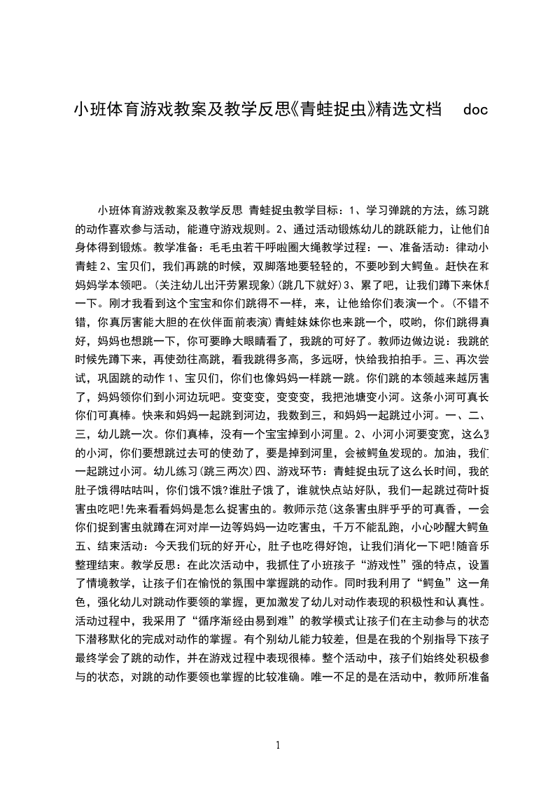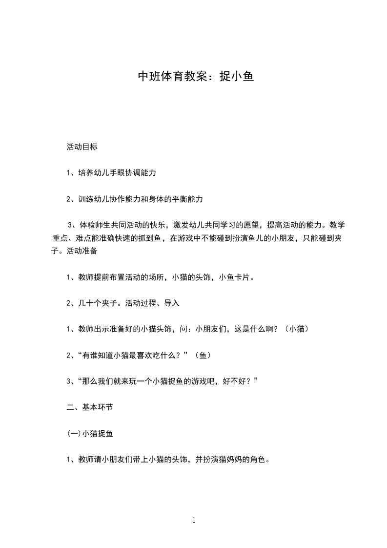 四、延伸活动在日常生活中多给幼儿提一些身体动作的要求,以培养他们身体运动的各种能力。教学反思本次活动主要是培养幼儿手眼协调能力,训练了他们的协作能力和身体的平衡能力。但在捉活鱼的环节当中,好多小朋友都不能准确的捉住夹子,更别说不碰到扮演小鱼的幼儿,有的小朋友更是一条鱼都没抓上。我想可能是平时对孩子们身体的协调性训练的太少了,一直与他们在玩捉鱼游戏的时候没那么顺利。在以后的教学活动中,我一定要对孩子们多做这方面的练习,以提高他们身体运动的各种能力。