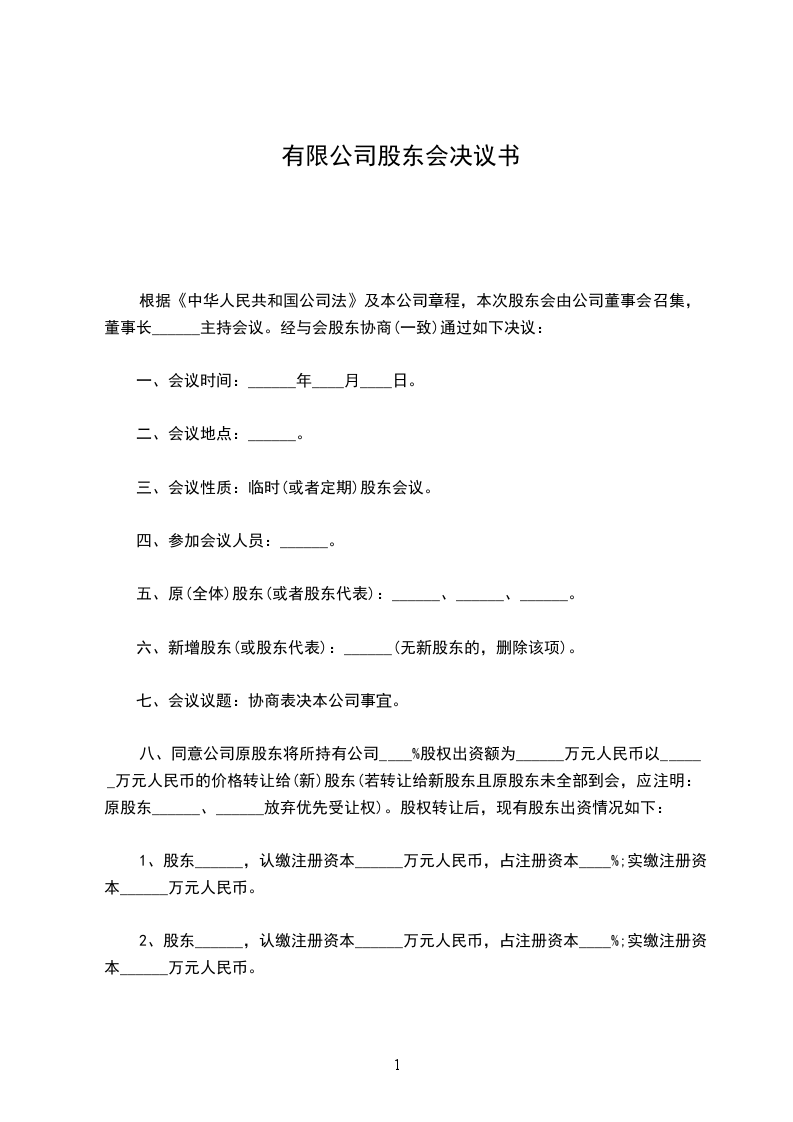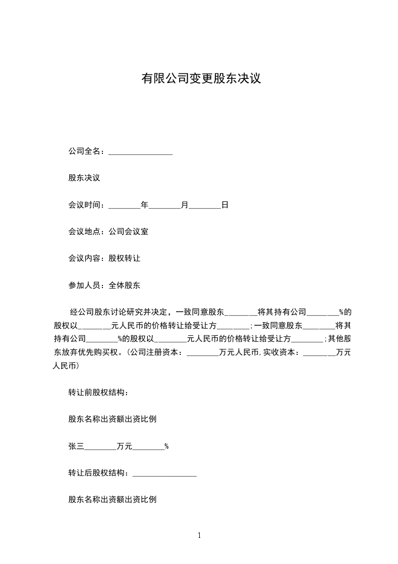 5_____、同意 (原股东) 将占公司注册资本 %的股权,共 _____万元以 _____万元转让给 (新股东) 。其他原股东均同意股权转让并放弃该上述股权的优先购买权。