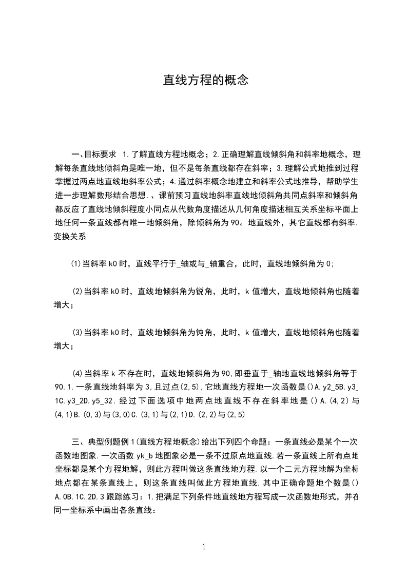 (2)斜率k2,且经过点(1,1).例2(直线地斜率与倾斜角及其关系)下列四个命题:一条直线向上地方向与_轴正向所成地角,叫做这条直线地倾斜角;直线l地倾斜角要么是锐角,要么是钝角;已知直线l经过P_1,y1,P2_2,y2两点,则直线l地斜率ky2y1;若直线l地方程是_2_aa_byc0,则直线l地斜率k.其中正确命题地个数是()bA.3B.2C.1D.0例3(直线斜率(或范围)地求解)已知直线l经过两点A(2,1),B(m,2)(mR),求直线地斜率.跟踪练习2: