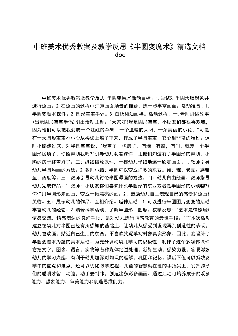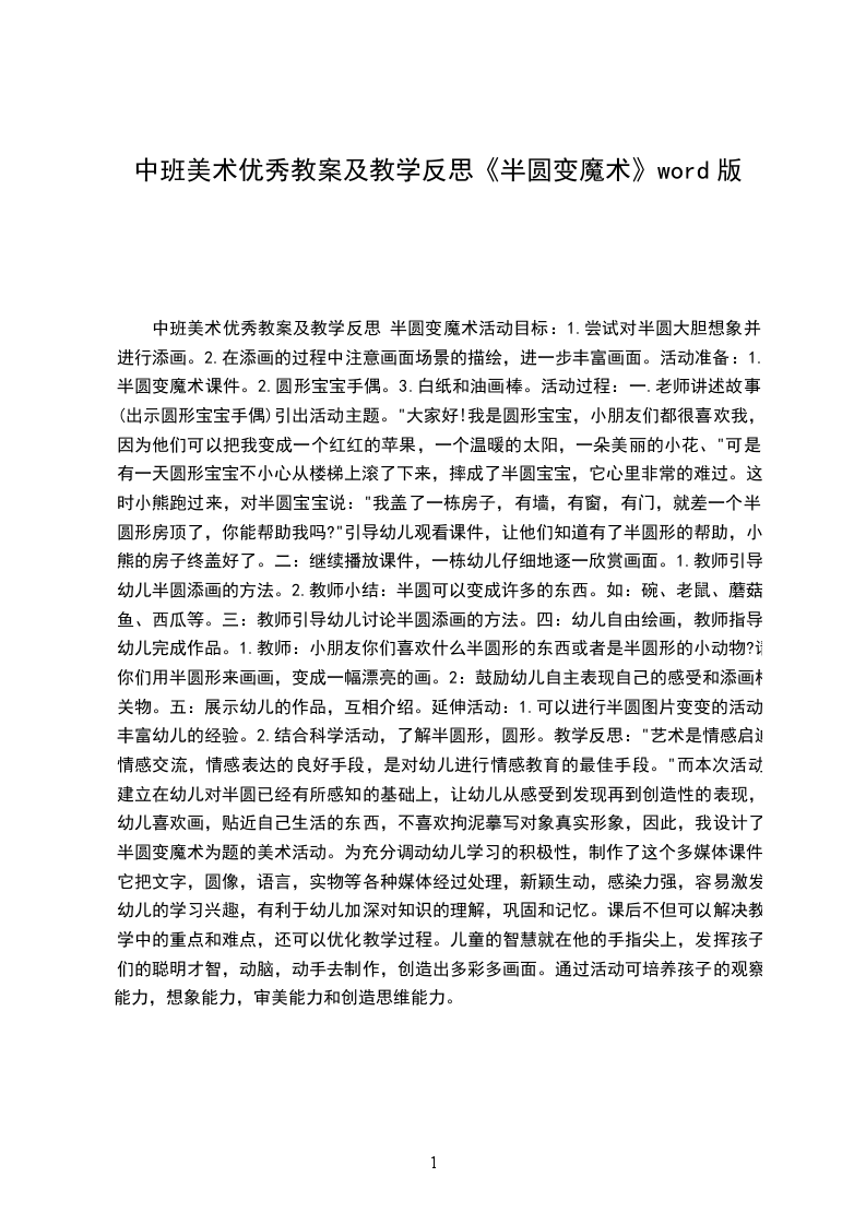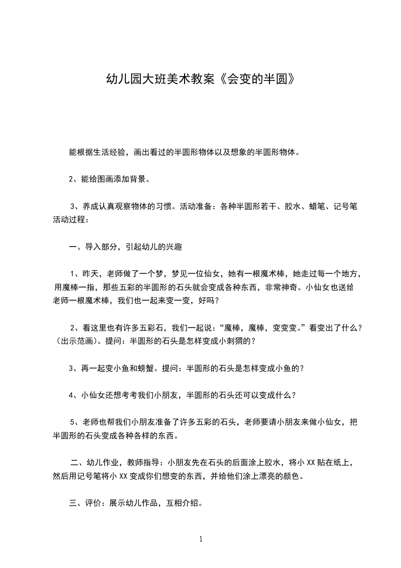 3、养成认真观察物体的习惯。活动准备:各种半圆形若干、胶水、蜡笔、记号笔活动过程: