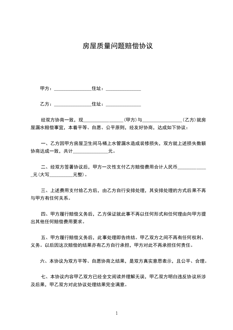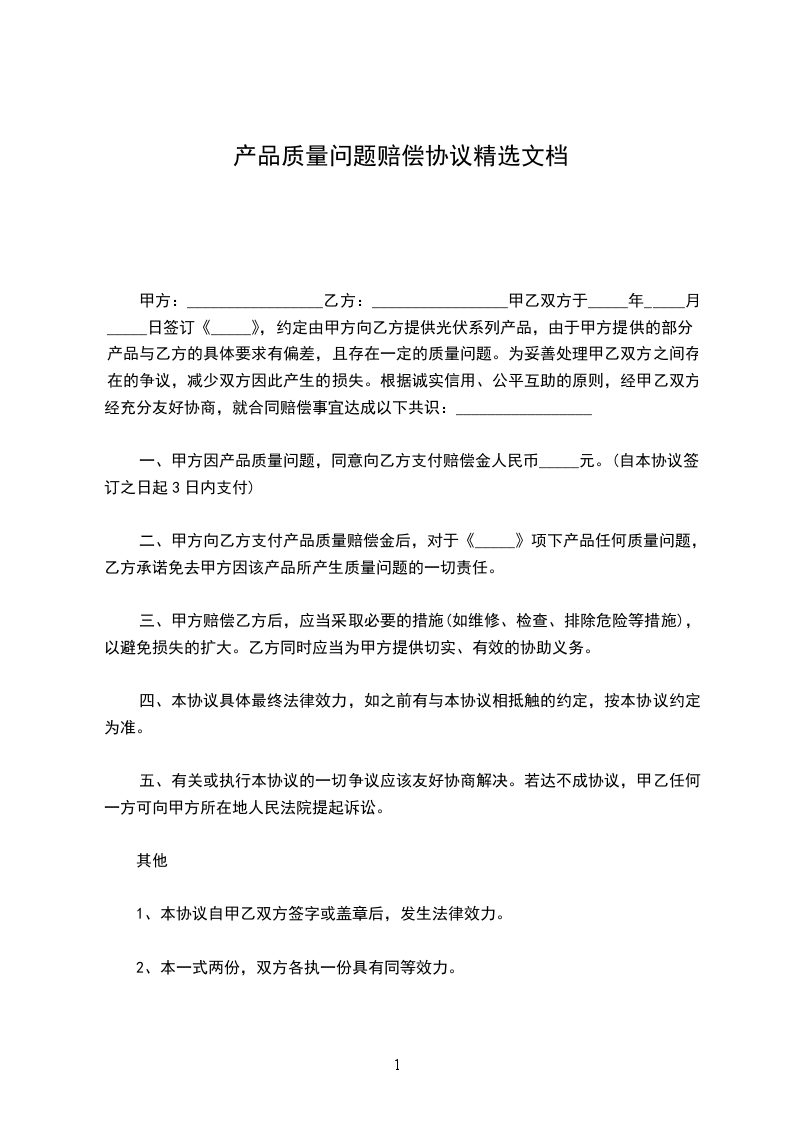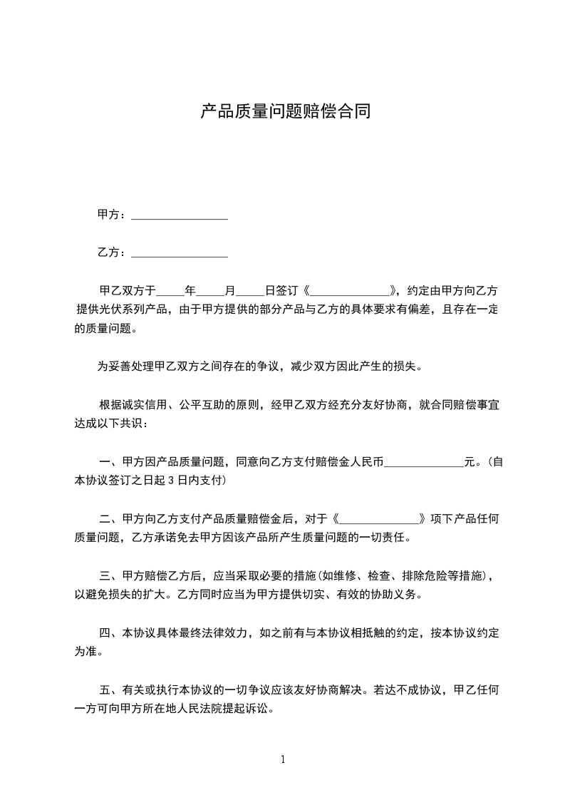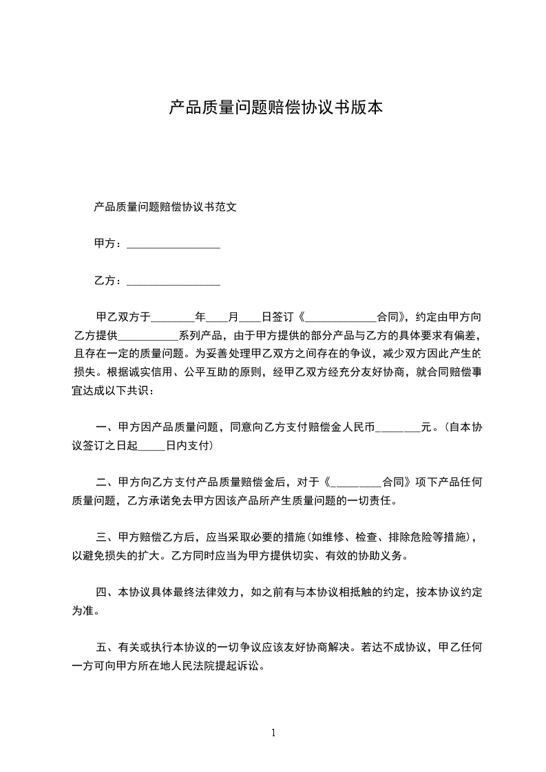 一、甲方因产品质量问题,同意向乙方支付赔偿金人民币________元。(自本协议签订之日起_____日内支付)