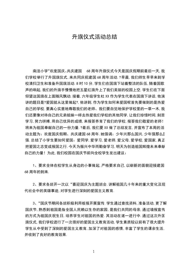 南洼小学“欢度国庆、共庆建国68周年升旗仪式今天是国庆假期前最后一天,我们学校举行了升国旗仪式,来共同庆祝建国68周年活动.?早晨,我们师生早早来到学校清扫卫生和准备升国旗活动.8时10分,学生们在国旗下站着整洁的队伍,随着国歌声的响起,我们的升旗手慢慢地把五星红旗升上了我们美丽的校园上空.学生们在下面仰望这国旗在上面随风飘动.接着,六年级学生杜XX作为学生代表在国旗下讲话,他演讲的题目是?爱国就从这里做起?,他讲到,作为学生如何来爱国呢首先要做到的是热爱自己的学校.要真心实意地尊敬我们的老师、我们要自觉地保护学校里的一草一木,我们还要像对待自己的兄弟姐妹一样去热爱我们学校的其他同学,让我们珍惜时间,刻苦学习,努力拼搏,用自己优异的成绩,来报答养育了我们的学校,报答我们敬爱的老师!将来为祖国奉献自己的一份力量.?最后,我们夏XX做了总结发言,并宣布了本周的活动主题为:欢度国庆假期、共庆建国68周年.她强调:少年兴那么国兴,少年强那么国强.总结了小学生要如何爱国:爱同学,爱学习,爱老师,爱父母,爱学校,爱国家,真正把爱国之志变成报国之行.今天为振兴中华而勤奋学习,明天为创造祖国辉煌未来奉献自己的力量!为此,我们校园在国庆节前向全校学生发出建议: