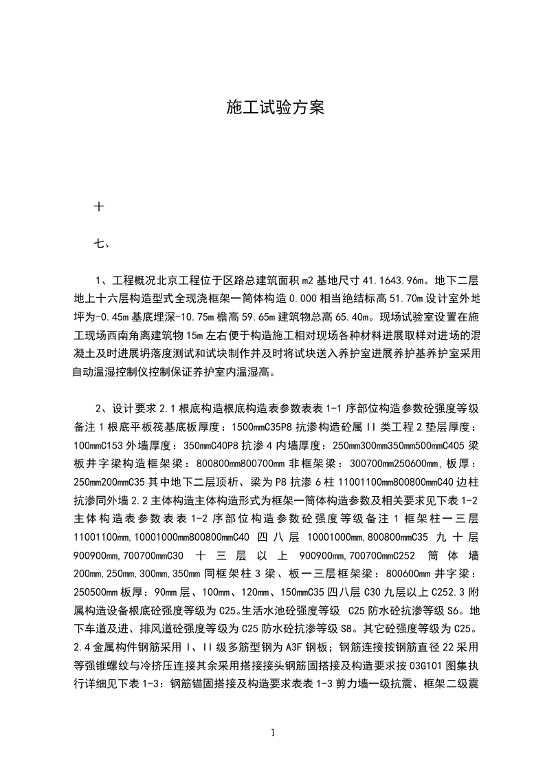 1、工程概况北京工程位于区路总建筑面积m2基地尺寸41.1643.96m。地下二层地上十六层构造型式全现浇框架一筒体构造0.000相当绝结标高51.70m设计室外地坪为-0.45m基底埋深-10.75m檐高59.65m建筑物总高65.40m。现场试验室设置在施工现场西南角离建筑物15m左右便于构造施工相对现场各种材料进展取样对进场的混凝土及时进展坍落度测试和试块制作并及时将试块送入养护室进展养护基养护室采用自动温湿控制仪控制保证养护室内温湿高。