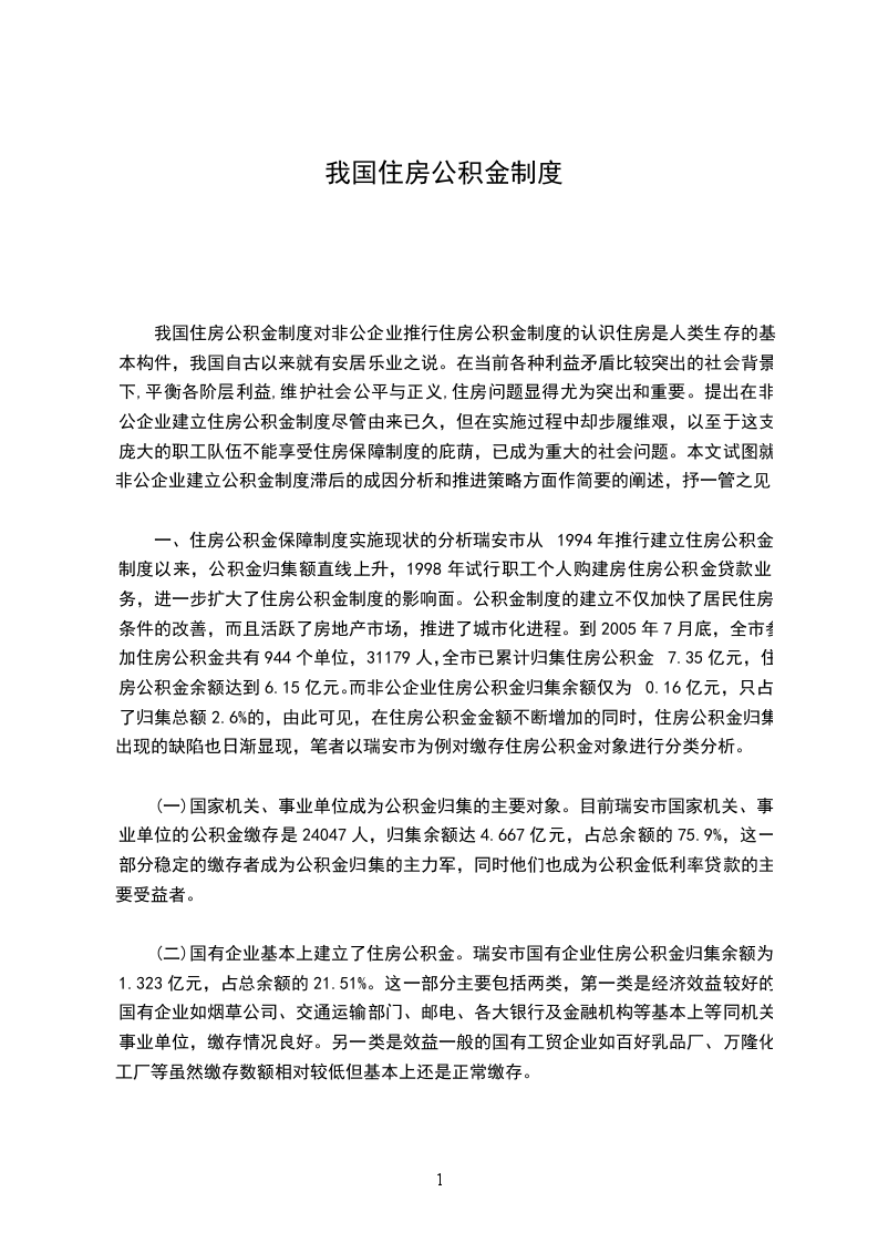 一、 住房公积金保障制度实施现状的分析瑞安市从1994年推行建立住房公积金制度以来,公积金归集额直线上升,1998年试行职工个人购建房住房公积金贷款业务,进一步扩大了住房公积金制度的影响面。公积金制度的建立不仅加快了居民住房条件的改善,而且活跃了房地产市场,推进了城市化进程。到2005年7月底,全市参加住房公积金共有944个单位,31179人,全市已累计归集住房公积金7.35亿元,住房公积金余额达到6.15亿元。而非公企业住房公积金归集余额仅为0.16亿元,只占了归集总额2.6%的,由此可见,在住房公积金金额不断增加的同时,住房公积金归集出现的缺陷也日渐显现,笔者以瑞安市为例对缴存住房公积金对象进行分类分析。