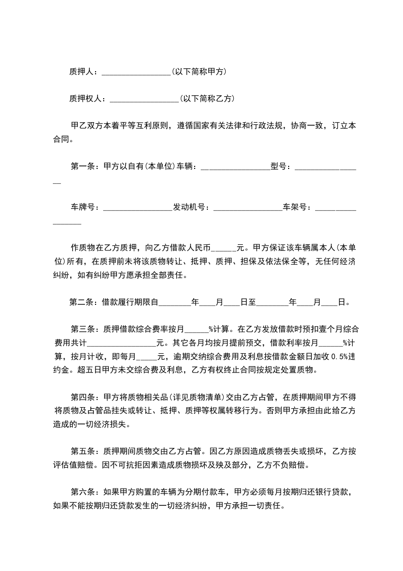 作质物在乙方质押,向乙方借款人民币______元。甲方保证该车辆属本人(本单位)所有,在质押前未将该质物转让、抵押、质押、担保及依法保全等,无任何经济纠纷,如有纠纷甲方愿承担全部责任。