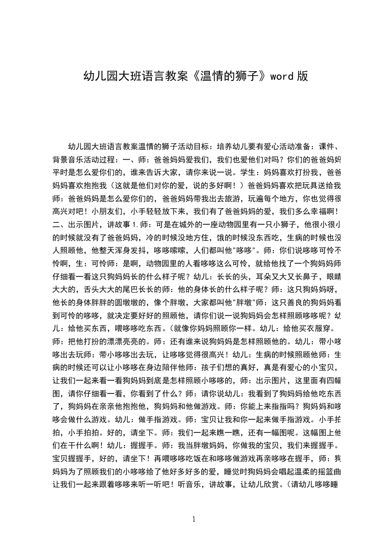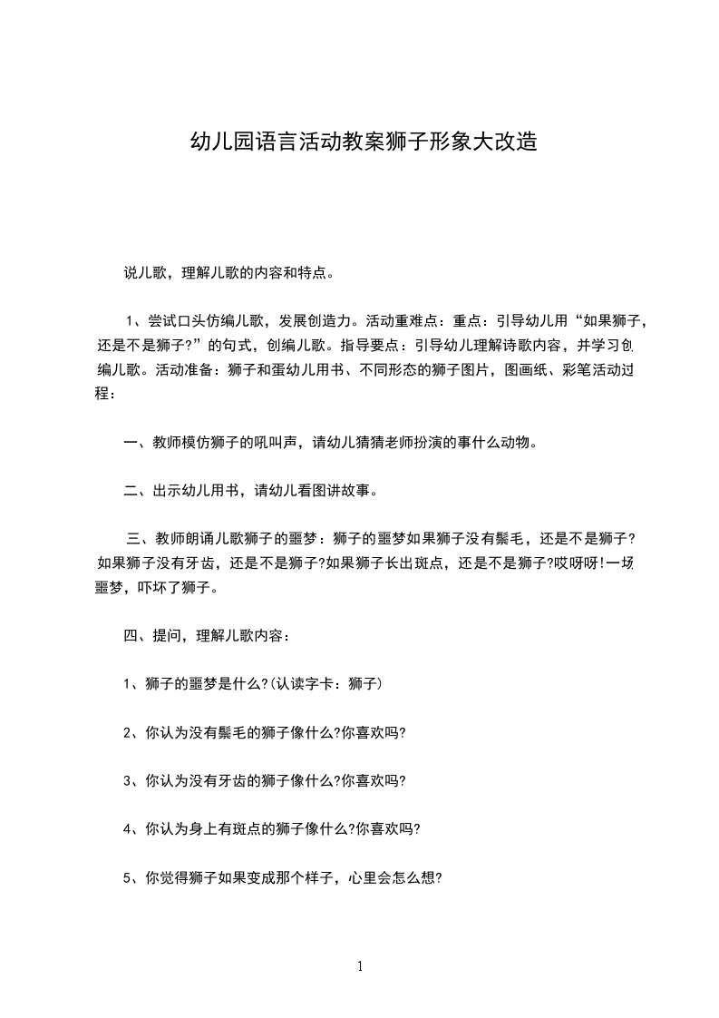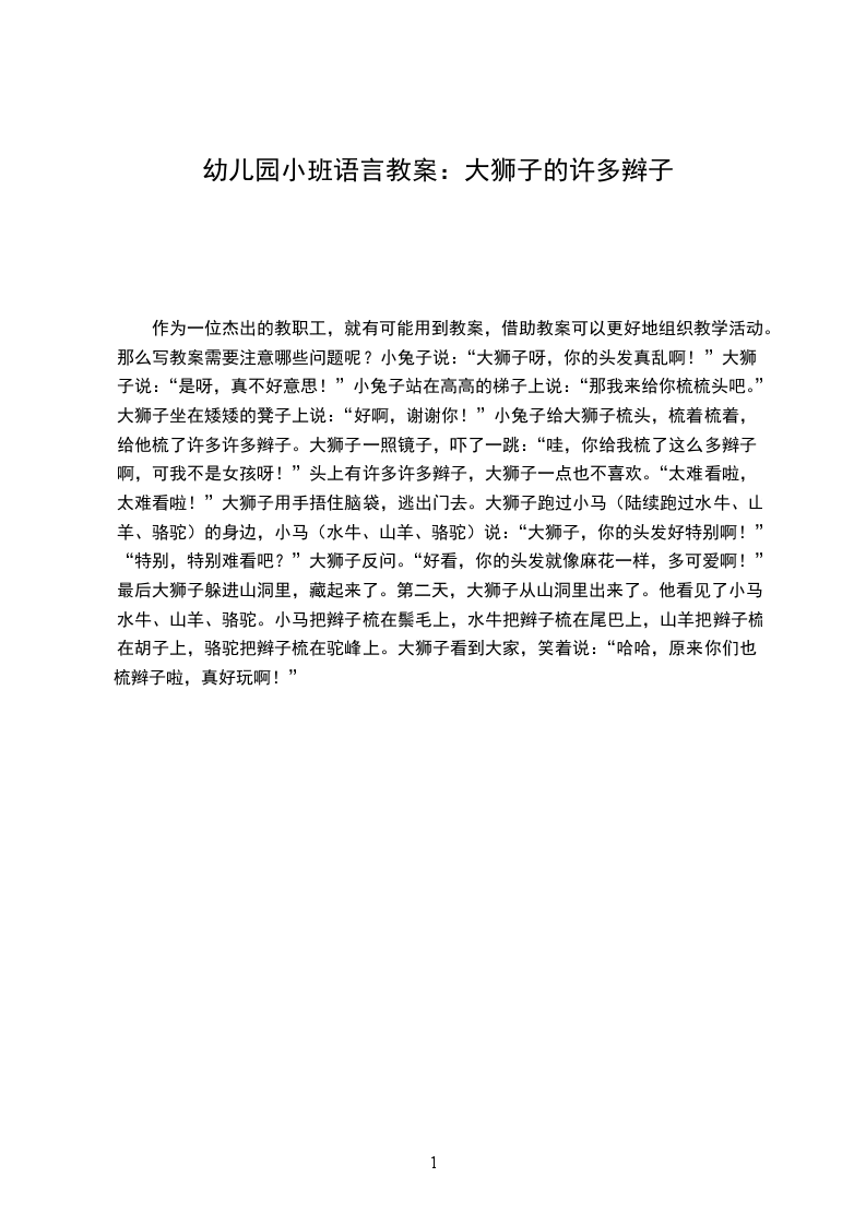 幼儿园大班语言教案理发狮和被理发狮大班语言公开课教案理发狮和被理发狮教学课时:30分钟设计思路:理发狮和被理发狮是一则真挚动人又富有情趣的绘本故事。故事中的主人公小狮子老九善良、乐观、不怕困难,要做一个别人都没有做过的工作讲讲议议故事续编故事活动过程: