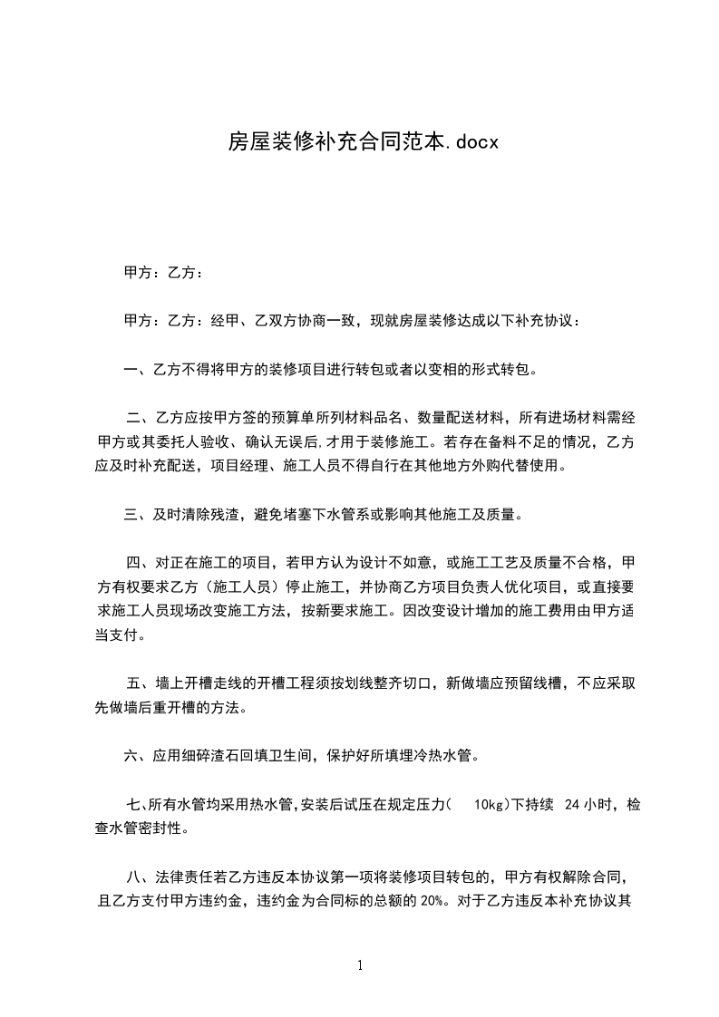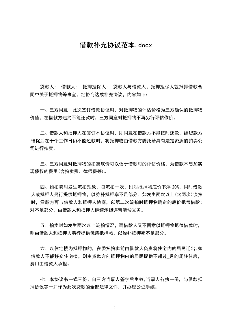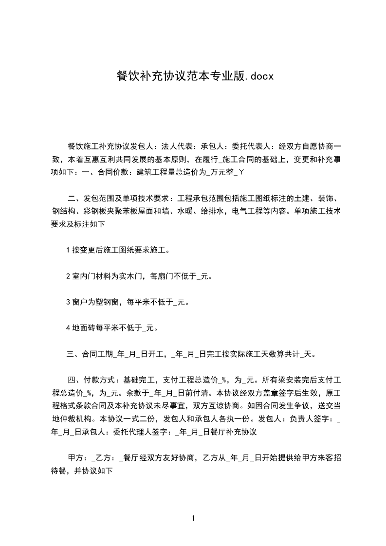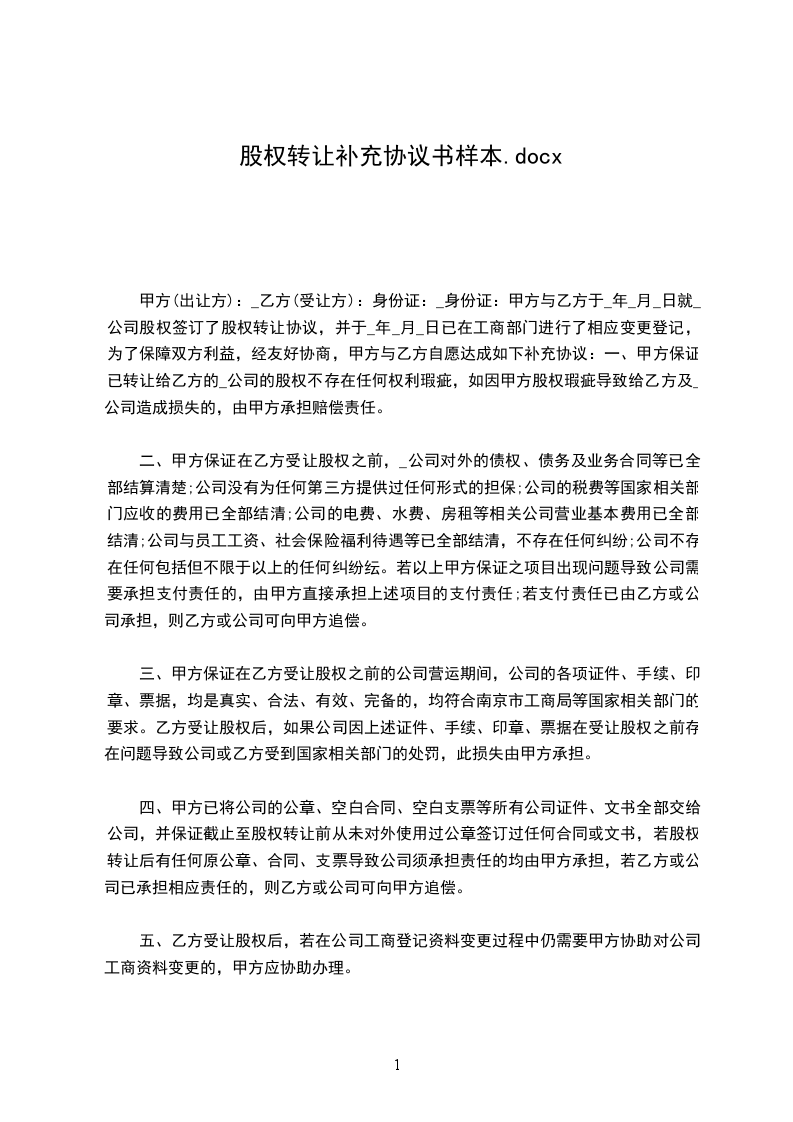 1、甲方:乙方:(公章)(公章)法定代表人或委托代理人签字:_签字:_合同补充协议范本本协议一式两份,甲方一份,乙方一份,具有同等法律效力,自双方签字盖章之日起生效。