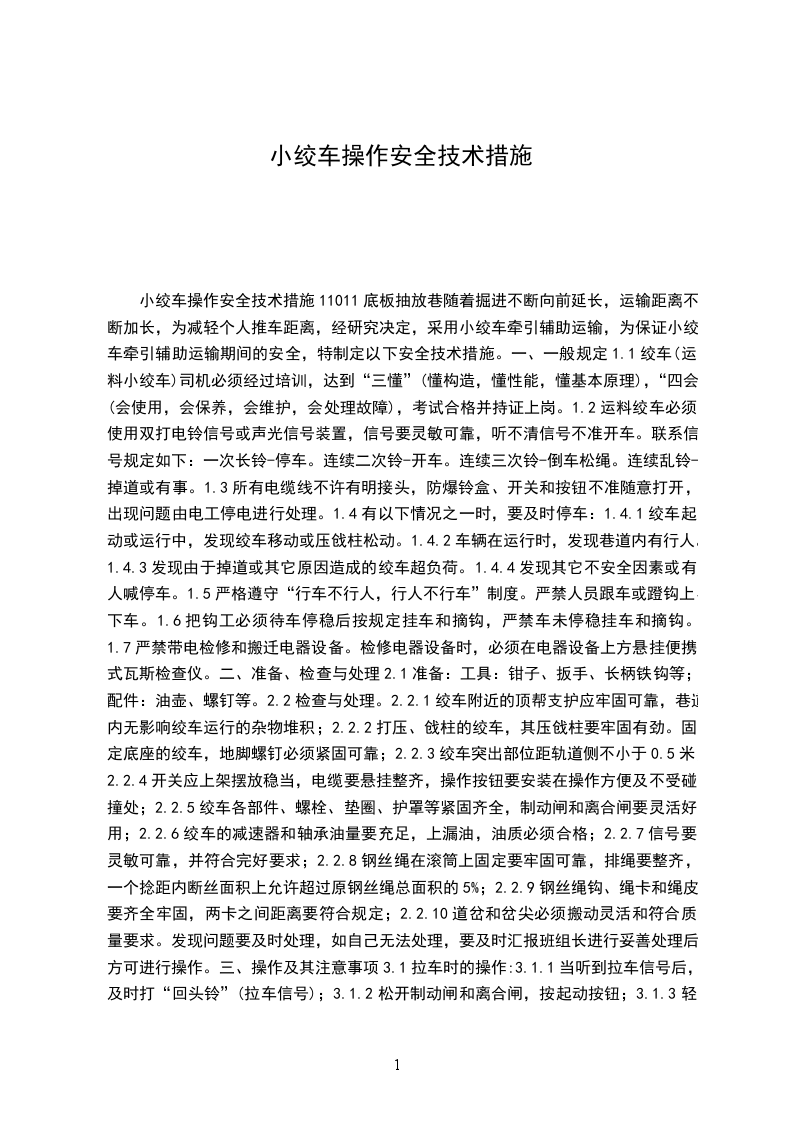 小绞车操作安全技术措施11011底板抽放巷随着掘进不断向前延长,运输距离不断加长,为减轻个人推车距离,经研究决定,采用小绞车牵引辅助运输,为保证小绞车牵引辅助运输期间的安全,特制定以下安全技术措施。一、一般规定1.1绞车(运料小绞车)司机必须经过培训,达到“三懂”(懂构造,懂性能,懂基本原理),“四会”(会使用,会保养,会维护,会处理故障),考试合格并持证上岗。1.2运料绞车必须使用双打电铃信号或声光信号装置,信号要灵敏可靠,听不清信号不准开车。联系信号规定如下:一次长铃-停车。连续二次铃-开车。连续三次铃-倒车松绳。连续乱铃-掉道或有事。1.3所有电缆线不许有明接头,防爆铃盒、开关和按钮不准随意打开,出现问题由电工停电进行处理。1.4有以下情况之一时,要及时停车:1.4.1绞车起动或运行中,发现绞车移动或压戗柱松动。1.4.2车辆在运行时,发现巷道内有行人。1.4.3发现由于掉道或其它原因造成的绞车超负荷。1.4.4发现其它不安全因素或有人喊停车。1.5严格遵守“行车不行人,行人不行车”制度。严禁人员跟车或蹬钩上、下车。1.6把钩工必须待车停稳后按规定挂车和摘钩,严禁车未停稳挂车和摘钩。1.7严禁带电检修和搬迁电器设备。检修电器设备时,必须在电器设备上方悬挂便携式瓦斯检查仪。二、准备、检查与处理2.1准备:工具:钳子、扳手、长柄铁钩等;配件:油壶、螺钉等。2.2检查与处理。2.2.1绞车附近的顶帮支护应牢固可靠,巷道内无影响绞车运行的杂物堆积;2.2.2打压、戗柱的绞车,其压戗柱要牢固有劲。固定底座的绞车,地脚螺钉必须紧固可靠;2.2.3绞车突出部位距轨道侧不小于0.5米;2.2.4开关应上架摆放稳当,电缆要悬挂整齐,操作按钮要安装在操作方便及不受碰撞处;2.2.5绞车各部件、螺栓、垫圈、护罩等紧固齐全,制动闸和离合闸要灵活好用;2.2.6绞车的减速器和轴承油量要充足,上漏油,油质必须合格;2.2.7信号要灵敏可靠,并符合完好要求;2.2.8钢丝绳在滚筒上固定要牢固可靠,排绳要整齐,一个捻距内断丝面积上允许超过原钢丝绳总面积的5%;2.2.9钢丝绳钩、绳卡和绳皮要齐全牢固,两卡之间距离要符合规定;2.2.10道岔和岔尖必须搬动灵活和符合质量要求。发现问题要及时处理,如自己无法处理,要及时汇报班组长进行妥善处理后方可进行操作。三、操作及其注意事项3.1拉车时的操作:3.1.1当听到拉车信号后,及时打“回头铃”(拉车信号);3.1.2松开制动闸和离合闸,按起动按钮;3.1.3轻压离合闸,使车轮慢慢起动后再将离合闸压下;3.1.4听到停车信号,慢松离合器,同时将制动闸压下,按停止按钮。3.2松车时的操作:3.2.1当听到松车信号后,及时打“回头铃”(松车信号);3.2.2松开离合闸,压下制动闸,按起动按钮;3.2.3慢松制动闸,均匀松车;3.2.4听到停车信号后,将制动闸压下,同时按停止按钮。3.3注意事项:3.3.1绞车在运转中,司机应经常注意电机和机械的响声,如声音上正常或有特殊的震动时,应立即停车检查原因;3.3.2钢丝绳在滚筒上缠绕时,应按顺序排列,最外层距滚筒边缘的高度,至少应为绳径的确2.5倊。底绳在滚筒上缠绕,不得少于6圈;3.3.3绞车运行中,严禁用手或脚直接拨动钢丝绳和检查机器的传动部分,检查绞车轴承的温升和油量时必须停车;3.3.4禁止绞车司机擅自离开绞车。绞车处于工作状态时,两手不准离开制动闸和离合闸。四、收尾工作4.1操作结束后应做好以下工作:4.1.1把钢丝绳全部缠在滚筒上;4.1.2切断电源,把开关手把打在断电位置,锁紧闭锁螺钉;4.1.3搞好绞车周围环境卫生;4.1.4盘好信号线,收拾好工具。4.2向接班人,班组长汇报运转情况,存在问题等。编制:杨XX
