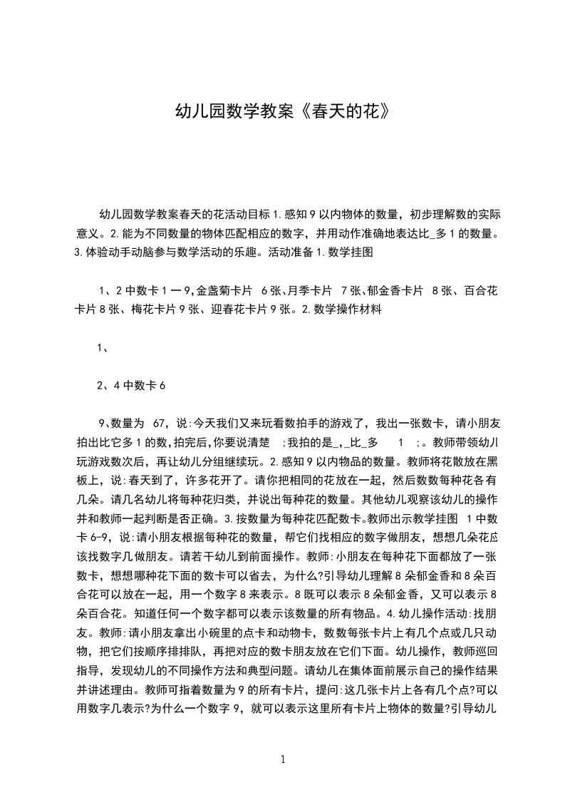 幼儿园数学教案春天的花活动目标1.感知9以内物体的数量,初步理解数的实际意义。2.能为不同数量的物体匹配相应的数字,并用动作准确地表达比_多1的数量。3.体验动手动脑参与数学活动的乐趣。活动准备1.数学挂图