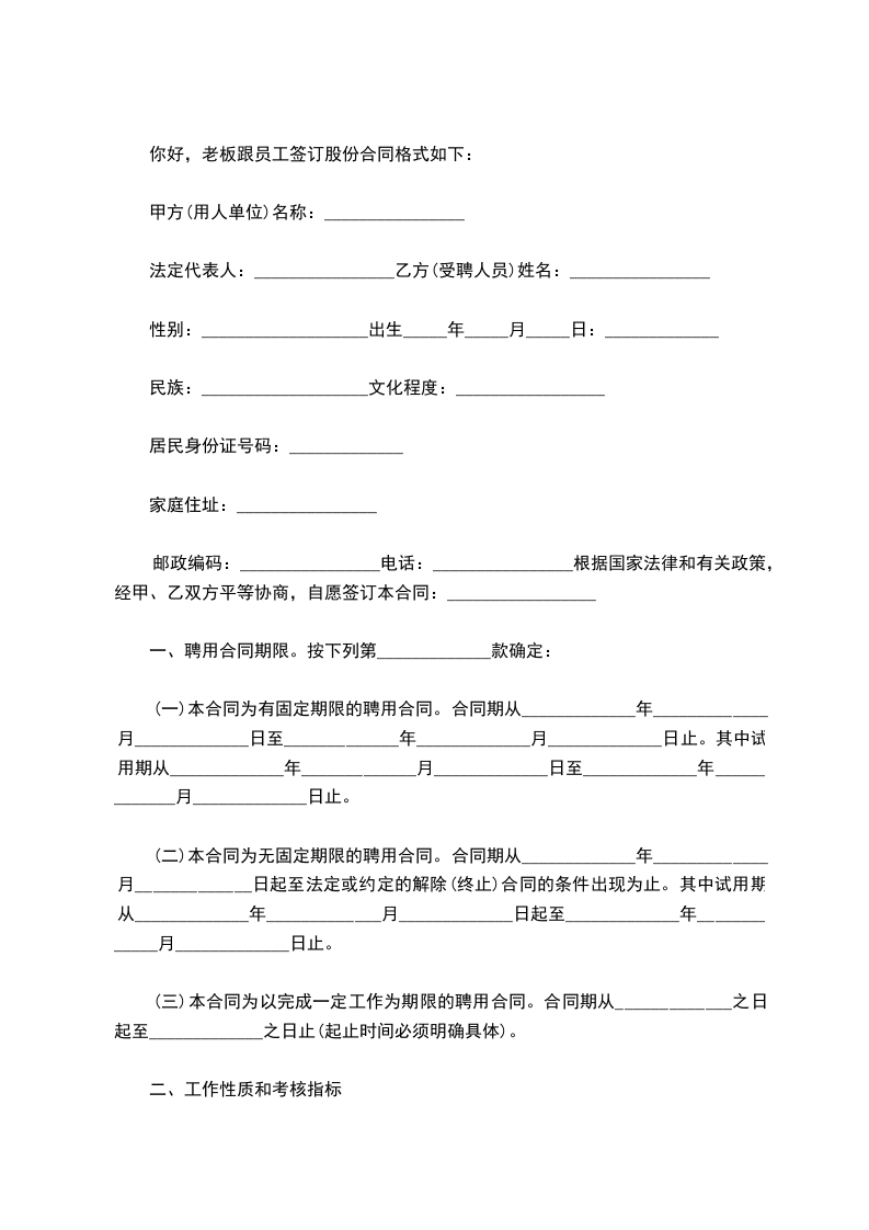 你好,老板跟员工签订股份合同格式如下: