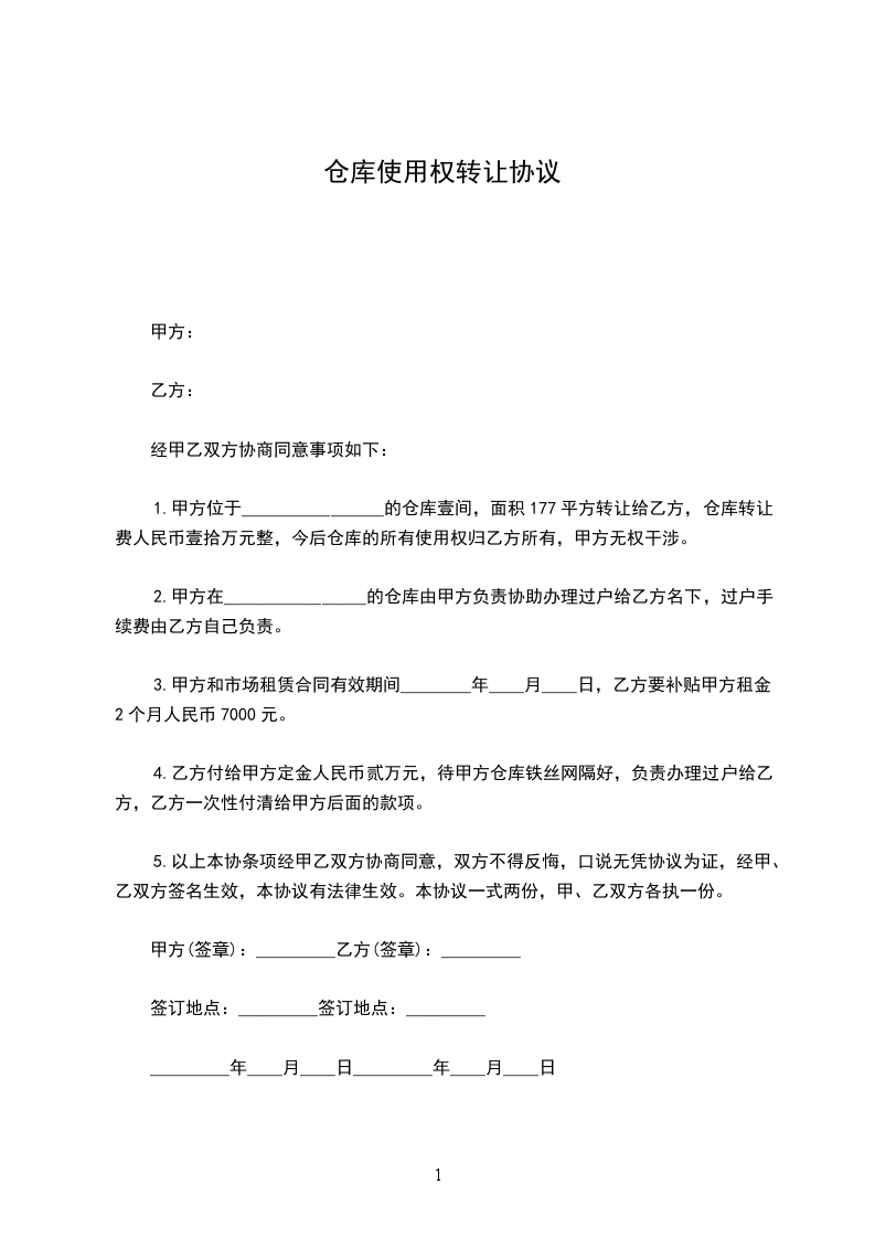 1.甲方位于________________的仓库壹间,面积177平方转让给乙方,仓库转让费人民币壹拾万元整,今后仓库的所有使用权归乙方所有,甲方无权干涉。