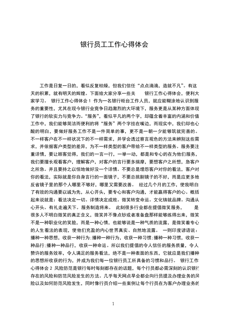 一、主动服务、整体服务的观念。礼貌优质服务活动是一项长期的系统性工程,从领导到员工,从一线到二线,从经营业务到内部管理,从行里到行外,都要相互配合协调,使企业的经营目标转化为人的自觉行动。 服务是银行经营的载体,是银行经营不行缺少的有机组成部分。银行经营务必透过银行服务才能实现,银行服务本质上就是银行经营。在金融业竞争日趋激烈的这天,一家银行的服务范围、服务资料、服务效率和服务看法挺直影响其所能吸引的客户数量和工作效率,因此,提高银行的服务水平,关系到银行经营的规模质量和效率,关系到银行的竞争潜力,决定了银行的经营效益和长远进展。 银行工作心得体会5 在兴业工作已经一个星期,这是我第一次进银行工作。在经过一个星期的努力工作,虽然到目前为止,我还没有签下自己的第一单,但也有了一点的收获。现在对自己的工作做一下总结。目的在 吸取教训,提高自己,以至 把工作做的更好,自己有信念也有决心把以后的工作做的更好。 在工作之前我只听说过pos机,并不是很了解银行的这项业务,而且对市场也毫不了解。但在接受银行的培训和向有阅历的同事请教之后对该项业务有了进一步的了解。在经过一个星期的团队合作和一边学习产品,一边摸索市场,遇到销售和产品方面的难点和问题,我们准时向领导请教,一起寻求解决问题的方案和对一些比较难缠的客户讨论针对性策略,取得了良好的效果。 通过团队合作和不断地学习产品学问,收取同行业之间的信息,查找市尝收集市场信息和积累市场阅历,现在对市场有了肯定的认识和了解。在与客户沟通方面也有了肯定的进步,现在我已经可以清楚明白地向客户介绍我们的产品,对客户所提到的各种问题也渐渐能够应对自如,能与客户作进一步的沟通,而且收集了一些意向客户的资料。 在一个星期的工作中我也发觉自己还存在着很多的不足:对 市场了解的还不够深化;对该业务还不能全面把握,且对与此业务相关的其他业务还不够了解,造成不能非常清晰地向客户说明;在与客户沟通时还不够热忱,并且不能明确地把握客户的意向。 现在对接下来的工作做一个方案: