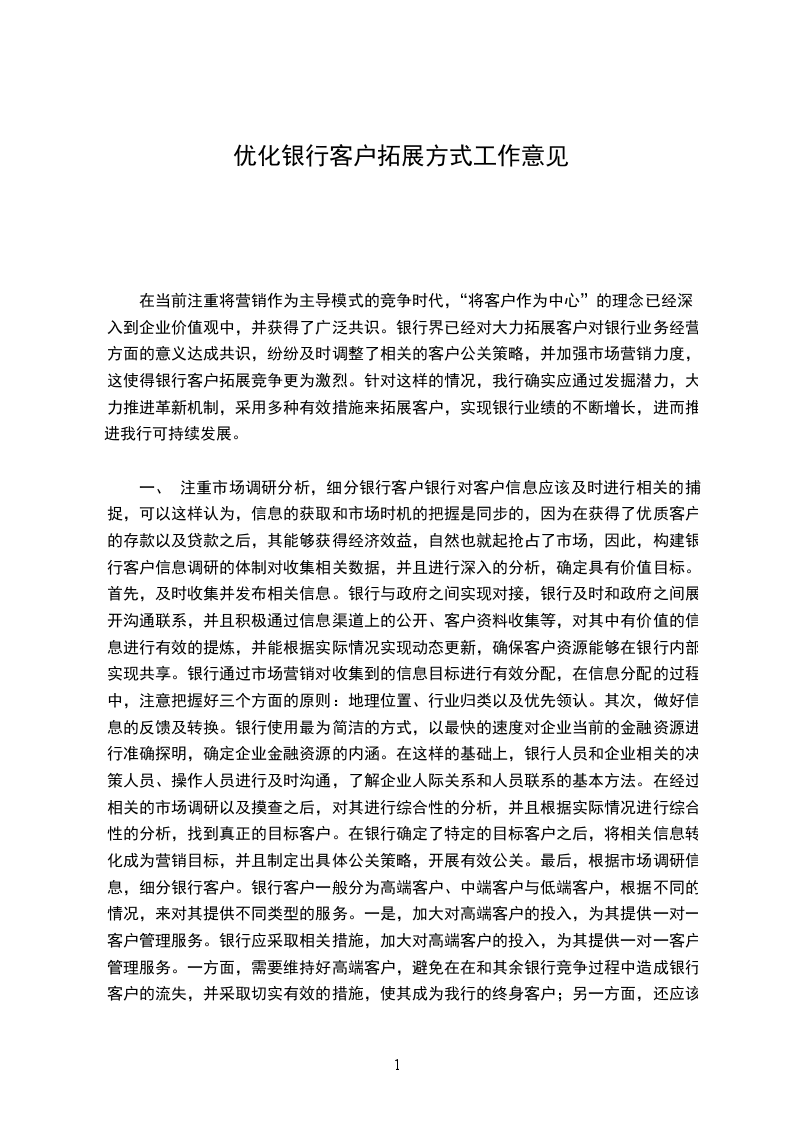 五、 创立向银行高端客户倾斜的资源配置模式在财务资源的科学配置方面,大力推动银行财务资源往经济效益好的地区进行适当倾斜,侧重向对银行整体贡献率高的高端客户倾斜。资金计划配置方面,对优质客户与项目投放借款,推行优惠利率;在银行相关人力资源的配置方面,通过相关措施进一步优化劳动组合。在人员配置方面要注重向银行前台倾斜,往银行业务多的方面进行倾斜。此外,银行后台管理部门也要切实发挥对前台开展营销横向方面的制约作用。针对银行的市场营销部门所开发的项目贷款和客户贷款,银行信贷管理部门要切实做到严格把控好信贷的准入关,按照银行审批规定来发放相关贷款;银行财务部门对市场营销部门所产生的全部费用展开成本核算,并积极引入责任会计方面的制度,将银行市场营销部门当成是利润中心开展成本核算,进一步加强市场营销部门在经济效益方面的意识;银行审计部门要定期针对营销部门相关项目拓展展开风险和效益评估,并对市场营销费用实际支出情况进行审计,真正做好风险规避方面的工作。总之,为了能在竞争激烈的银行界做大做强,积极开展客户拓展是有效的途径。我行在客户拓展上,应从注重市场调研分析,细分银行客户、创建科学合理的客户经理动态管理制度、加强客户满意度评价体系建设、创建银行质量服务系统,认真服务客户、创立向银行高端客户倾斜的资源配置模式等多种有效的方式,提升我行的银行客户拓展实力,创建高端客户与大众型中端客户相结合的稳定银行客户群,为我行今后的发展奠定坚实的基础。