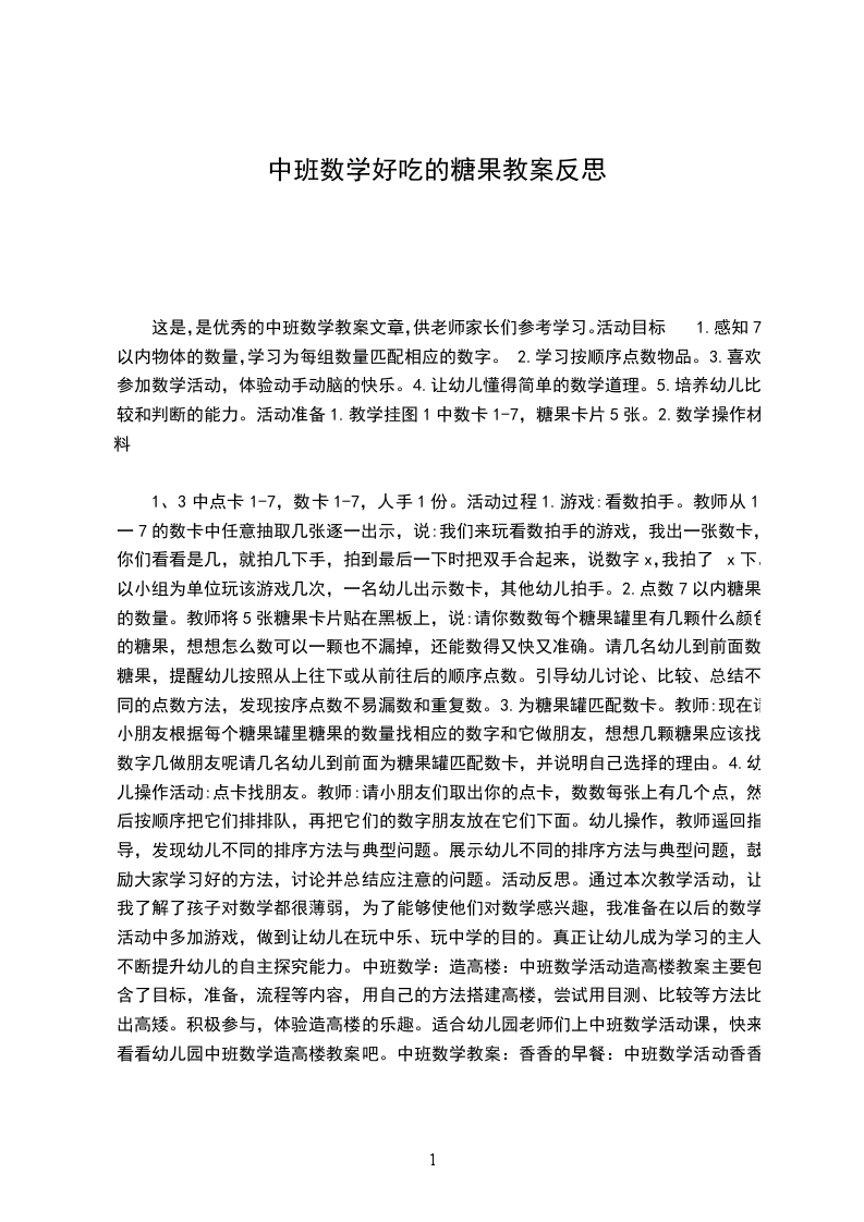 1、3中点卡1-7,数卡1-7,人手1份。活动过程1.游戏:看数拍手。教师从1一7的数卡中任意抽取几张逐一出示,说:我们来玩看数拍手的游戏,我出一张数卡,你们看看是几,就拍几下手,拍到最后一下时把双手合起来,说数字x,我拍了x下。以小组为单位玩该游戏几次,一名幼儿出示数卡,其他幼儿拍手。2.点数7以内糖果的数量。教师将5张糖果卡片贴在黑板上,说:请你数数每个糖果罐里有几颗什么颜色的糖果,想想怎么数可以一颗也不漏掉,还能数得又快又准确。请几名幼儿到前面数糖果,提醒幼儿按照从上往下或从前往后的顺序点数。引导幼儿讨论、比较、总结不同的点数方法,发现按序点数不易漏数和重复数。3.为糖果罐匹配数卡。教师:现在请小朋友根据每个糖果罐里糖果的数量找相应的数字和它做朋友,想想几颗糖果应该找数字几做朋友呢请几名幼儿到前面为糖果罐匹配数卡,并说明自己选择的理由。4.幼儿操作活动:点卡找朋友。教师:请小朋友们取出你的点卡,数数每张上有几个点,然后按顺序把它们排排队,再把它们的数字朋友放在它们下面。幼儿操作,教师遥回指导,发现幼儿不同的排序方法与典型问题。展示幼儿不同的排序方法与典型问题,鼓励大家学习好的方法,讨论并总结应注意的问题。活动反思。通过本次教学活动,让我了解了孩子对数学都很薄弱,为了能够使他们对数学感兴趣,我准备在以后的数学活动中多加游戏,做到让幼儿在玩中乐、玩中学的目的。真正让幼儿成为学习的主人,不断提升幼儿的自主探究能力。中班数学:造高楼:中班数学活动造高楼教案主要包含了目标,准备,流程等内容,用自己的方法搭建高楼,尝试用目测、比较等方法比出高矮。积极参与,体验造高楼的乐趣。适合幼儿园老师们上中班数学活动课,快来看看幼儿园中班数学造高楼教案吧。中班数学教案:香香的早餐:中班数学活动香香的早餐教案主要包含了活动目标,活动准备,活动反思,活动过程等内容,初步认识数字