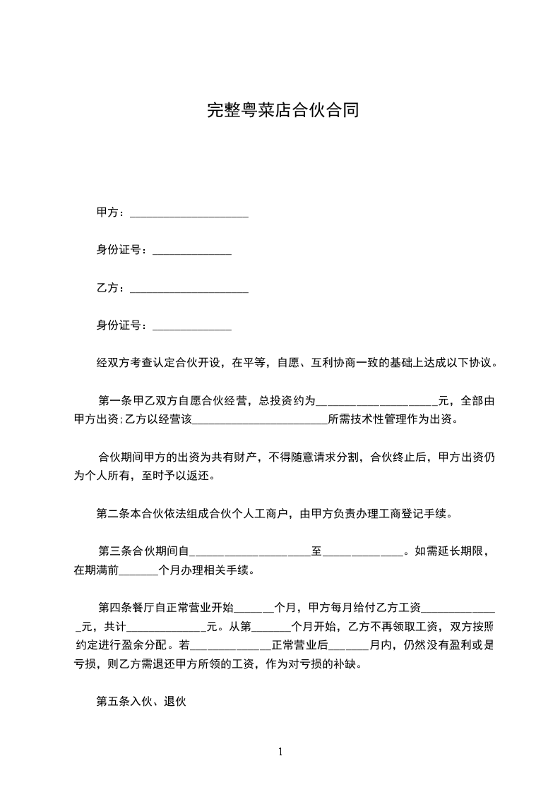 第一条甲乙双方自愿合伙经营,总投资约为_____________________元,全部由甲方出资;乙方以经营该________________________所需技术性管理作为出资。