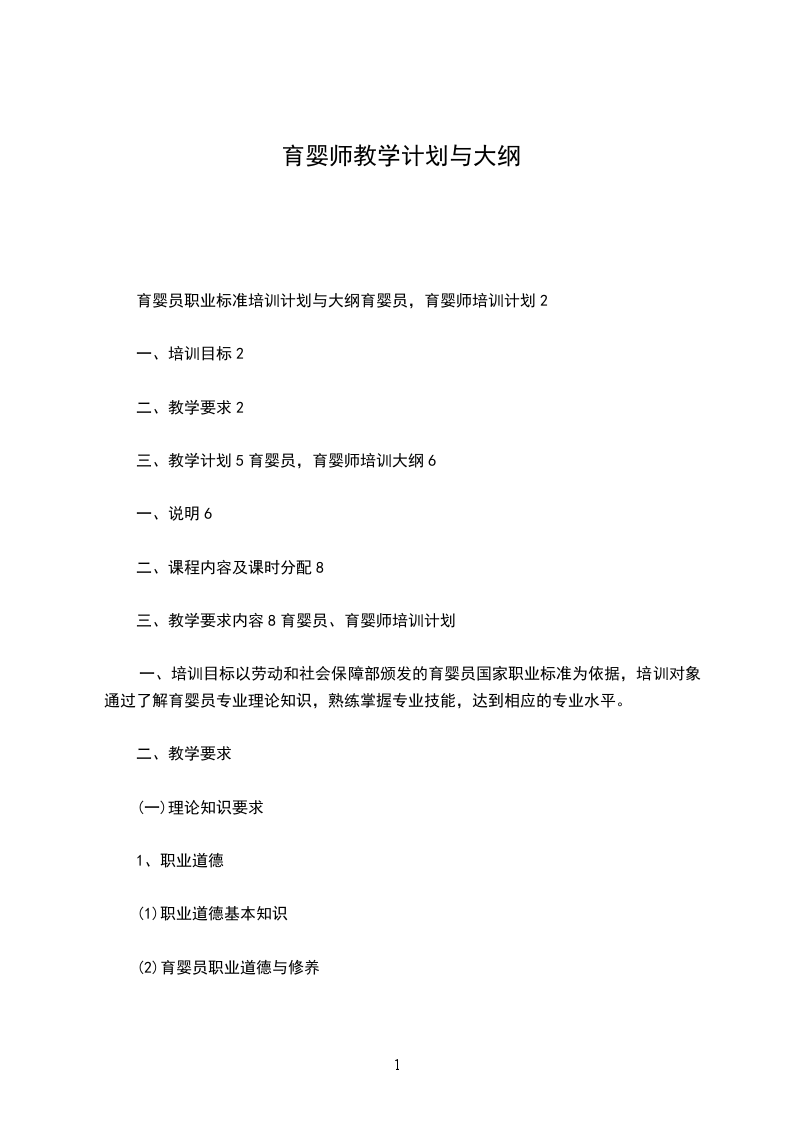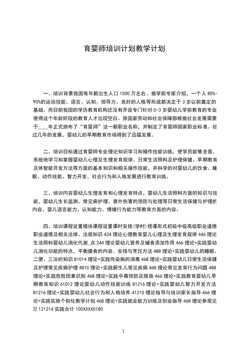 四、培训课程设置1.1职业名称育婴员1.2职业定义主要从事0-3岁婴儿照料、护理和教育的人员。1.3职业等级本职业共设三个等级,分别为:育婴师(国家职业资格五级)育婴师(国家职业资格四级)高级育婴师(国家职业资格三级)。1.4职业环境室内、外,常温。1.5职业能力特征有爱心、耐心和责任感;口齿清楚、会讲普通话;表达能力和沟通能力强;动作协调、灵活;有一定的学习能力。1.6基本文化程度初中毕业1.7培训要求1.7.1培训教师全日制职业学校教育,根据其培养目标和教学计划确定。晋级培训期限:育婴师不少于80标准时;育婴师不少100标准学时;高级育婴师不少1于学时、1.7.2培训教师培训育婴师、育婴师的教师应具备有本职业高级育婴师职业资格证或相关专业中级以上(含中级)专业技术职务任职资格;培训高级育婴师的教师应具有本职业高级职业资格证书2年以上或相关专业高级专业技术职务任职资格。1.7.3培训场地设备理论培训场地应具有可容纳于上学员的标准教室,并配备投影仪、电视机及播放设备。实际操作培训场所应具有40平方米和相关育婴设备(婴儿床、洗涤用具、婴儿食品配制及消毒用具,玩具、图书、挂图、手工制作教材及工具等)。1.8鉴定要求1.8.1适用对象从事或准备从事本职业的人员1.8.2申报条件初级育婴师(具备以下条件之一者)