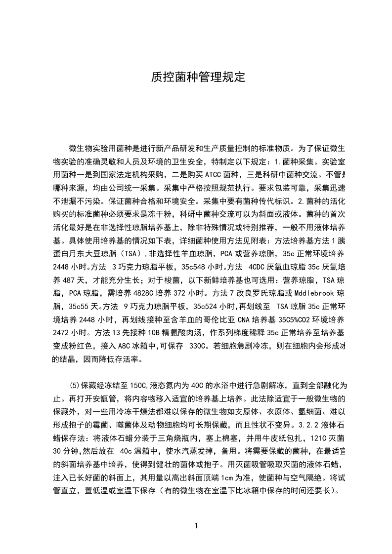 微生物实验用菌种是进行新产品研发和生产质量控制的标准物质。为了保证微生物实验的准确灵敏和人员及环境的卫生安全,特制定以下规定:1.菌种采集。实验室用菌种一是到国家法定机构采购,二是购买ATCC菌种,三是科研中菌种交流。不管是哪种来源,均由公司统一采集。采集中严格按照规范执行。要求包装可靠,采集迅速,不泄漏不污染。保证菌种合格和环境安全。采集中要有菌种传代标识。2.菌种的活化:购买的标准菌种必须要求是冻干粉,科研中菌种交流可以为斜面或液体。菌种的首次活化最好是在非选择性琼脂培养基上,除非特殊情况或特别推荐,一般不用液体培养基。具体使用培养基的情况如下表,详细菌种使用方法见附表:方法培养基方法1胰蛋白月东大豆琼脂(TSA),非选择性羊血琼脂,PCA或营养琼脂,35c正常环境培养2448小时。方法3巧克力琼脂平板,35c548小时。方法4CDC厌氧血琼脂35c厌氧培养487天,才能充分生长;对于梭菌,以下新鲜培养基也可选用:营养琼脂,TSA琼脂,PCA琼脂,需培养4828C培养372小时。方法7改良罗氏琼脂或Mddlebrook琼脂,35c55天。方法9巧克力琼脂平板,35c524小时,再划线至TSA琼脂35c正常环境培养2448小时,再划线接种至含羊血的哥伦比亚CNA培养基35C5%CO2环境培养2472小时。方法13先接种10B精氨酸肉汤,作系列梯度稀释35c正常培养至培养基变成粉红色,接入A8C冰箱中,可保存330C。若细胞急剧冷冻,则在细胞内会形成冰的结晶,因而降低存活率。