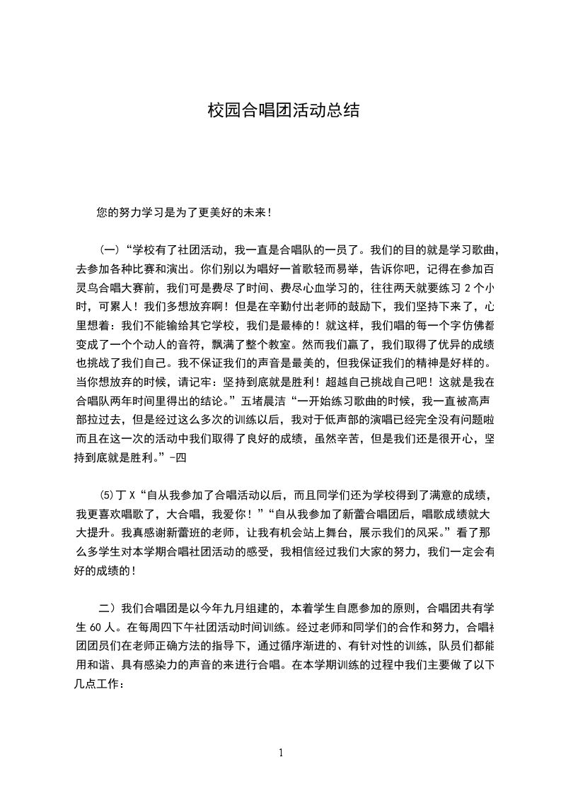 (一)“学校有了社团活动,我一直是合唱队的一员了。我们的目的就是学习歌曲,去参加各种比赛和演出。你们别以为唱好一首歌轻而易举,告诉你吧,记得在参加百灵鸟合唱大赛前,我们可是费尽了时间、费尽心血学习的,往往两天就要练习2个小时,可累人!我们多想放弃啊!但是在辛勤付出老师的鼓励下,我们坚持下来了,心里想着:我们不能输给其它学校,我们是最棒的!就这样,我们唱的每一个字仿佛都变成了一个个动人的音符,飘满了整个教室。然而我们赢了,我们取得了优异的成绩,也挑战了我们自己。我不保证我们的声音是最美的,但我保证我们的精神是好样的。当你想放弃的时候,请记牢:坚持到底就是胜利!超越自己挑战自己吧!这就是我在合唱队两年时间里得出的结论。”五堵晨洁“一开始练习歌曲的时候,我一直被高声部拉过去,但是经过这么多次的训练以后,我对于低声部的演唱已经完全没有问题啦,而且在这一次的活动中我们取得了良好的成绩,虽然辛苦,但是我们还是很开心,坚持到底就是胜利。”-四
