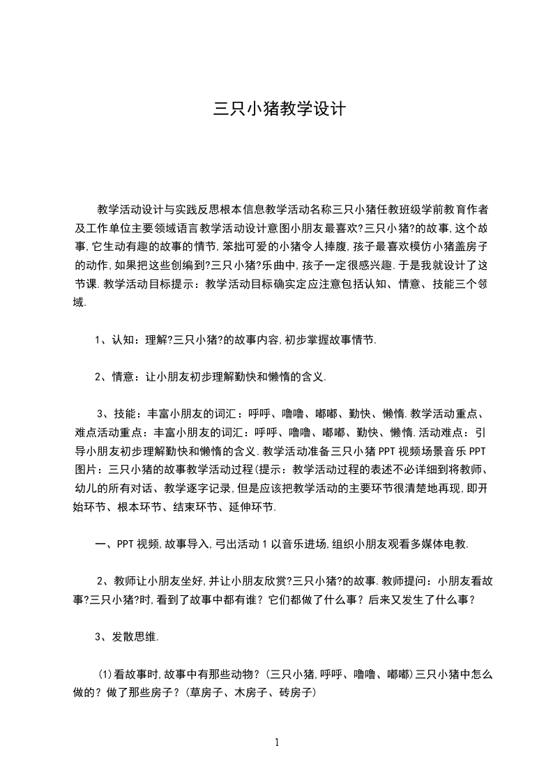 教学活动设计与实践反思根本信息教学活动名称三只小猪任教班级学前教育作者及工作单位主要领域语言教学活动设计意图小朋友最喜欢?三只小猪?的故事,这个故事,它生动有趣的故事的情节,笨拙可爱的小猪令人捧腹,孩子最喜欢模仿小猪盖房子的动作,如果把这些创编到?三只小猪?乐曲中,孩子一定很感兴趣.于是我就设计了这节课.教学活动目标提示:教学活动目标确实定应注意包括认知、情意、技能三个领域.