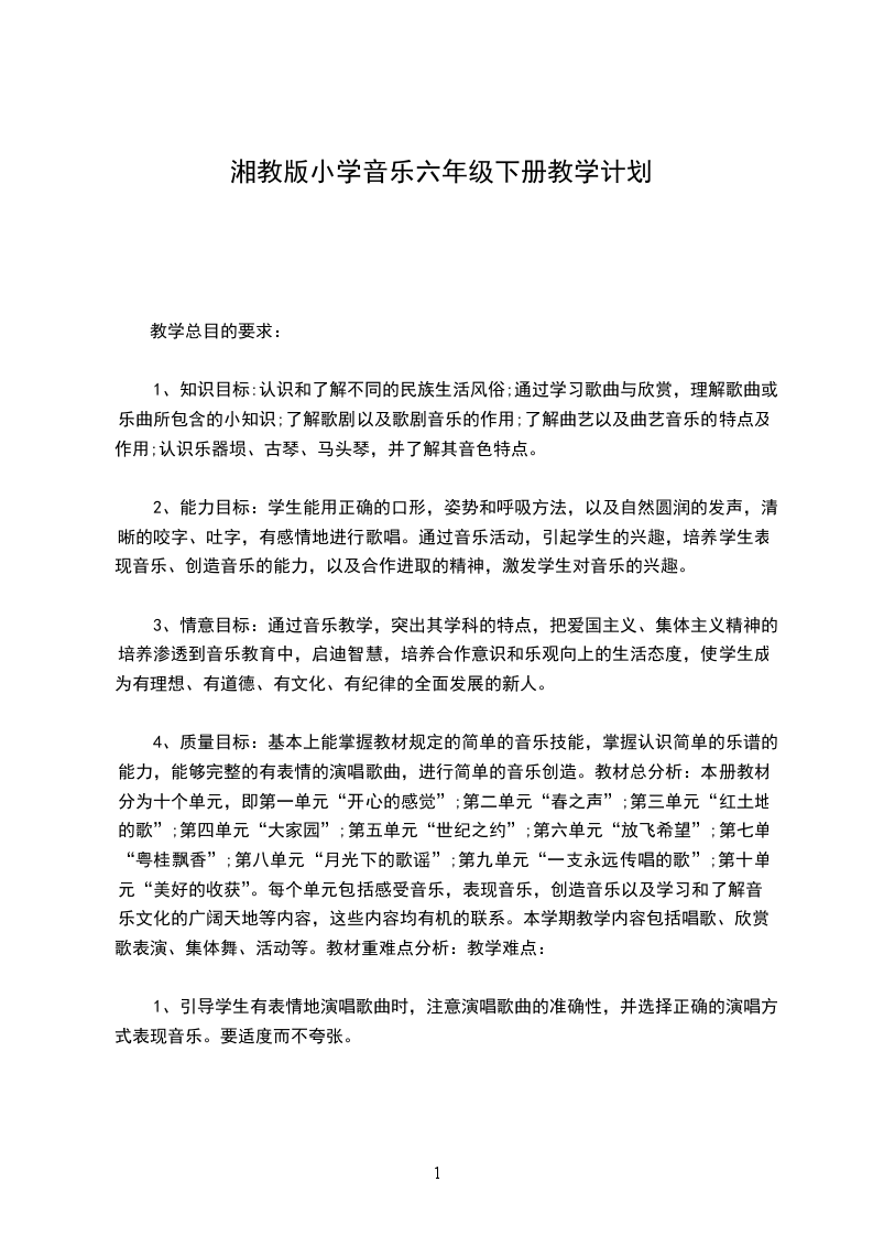 4、质量目标:基本上能掌握教材规定的简单的音乐技能,掌握认识简单的乐谱的能力,能够完整的有表情的演唱歌曲,进行简单的音乐创造。教材总分析:本册教材分为十个单元,即第一单元“开心的感觉”;第二单元“春之声”;第三单元“红土地的歌”;第四单元“大家园”;第五单元“世纪之约”;第六单元“放飞希望”;第七单“粤桂飘香”;第八单元“月光下的歌谣”;第九单元“一支永远传唱的歌”;第十单元“美好的收获”。每个单元包括感受音乐,表现音乐,创造音乐以及学习和了解音乐文化的广阔天地等内容,这些内容均有机的联系。本学期教学内容包括唱歌、欣赏、歌表演、集体舞、活动等。教材重难点分析:教学难点: