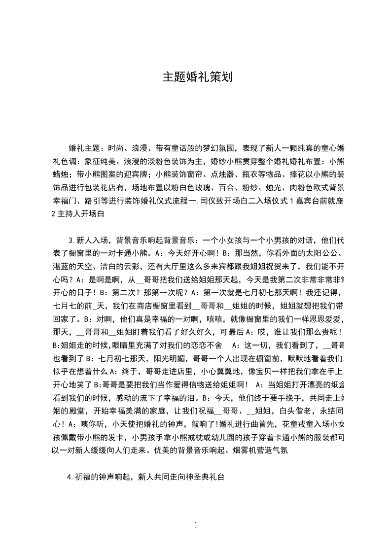 婚礼主题:时尚、浪漫、带有童话般的梦幻氛围,表现了新人一颗纯真的童心婚礼色调:象征纯美、浪漫的淡粉色装饰为主,婚纱小熊贯穿整个婚礼婚礼布置:小熊蜡烛;带小熊图案的迎宾牌;小熊装饰窗帘、点烛器、瓶衣等物品、捧花以小熊的装饰品进行包装花店有,场地布置以粉白色玫瑰、百合、粉纱、烛光、肉粉色欧式背景、幸福门、路引等进行装饰婚礼仪式流程一.司仪致开场白二入场仪式1嘉宾台前就座2主持人开场白