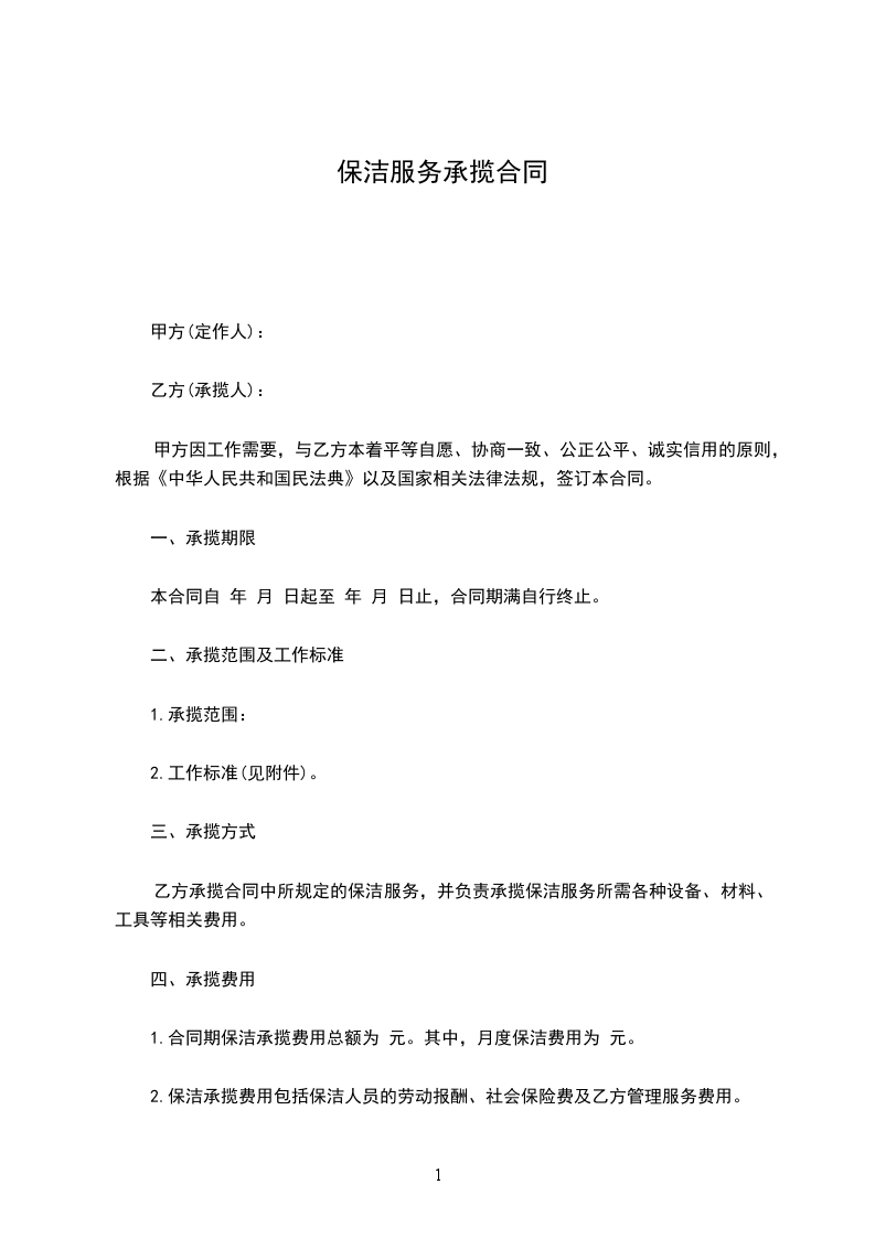 1.合同期保洁承揽费用总额为 元。其中,月度保洁费用为 元。