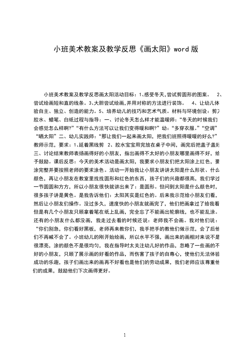 三、 讨论结束教师表扬画得好的小朋友,指出画得不太好的小朋友哪里画得不好,给予鼓励。教学反思:今天的美术活动是画太阳,我要求小朋友们把太阳涂上红色,要涂完整并要按照老师的要求涂色。活动一开始我让小朋友讲讲太阳是什么形状、什么颜色,再让小朋友在教室里找找圆形和红色的东西,孩子们的兴趣都很高,我们学过一节圆圆和方方,所以小朋友很快就讲出来了:是圆形。但问到太阳是什么颜色时,很多孩子讲是黄色。于是我告诉他们:太阳其实是红色的。后来我示范给小朋友们看,然后让小朋友们操作。没过多久,速度快的小朋友就画完了,他们把画拿过了给我看,但是有几个小朋友只顾拿着笔在纸上乱画,完全忘了不能画出轮廓线,也不能乱涂。还有的小朋友什么都没画,我走过去看的时候还说:老师我不会画。我对他们说:“你们别急,你们看好黑板,老师再来教你们,我手把手的教他们做示范,会了后他们不再喊不会了。小班幼儿的刚开始绘画,所以水平不强,画出来的画相对来说不是很漂亮,涂的颜色不是很均匀,我在指导时太关注幼儿好的作品,忽略了一些画的不好的小朋友,只顾了展示画的好看的作品,而伤害了孩子的自尊心,使他们无法体验成功的乐趣,孩子们画出来的画再不好看也是他们的劳动成果,我们老师应该尊重他们的成果,鼓励他们下次画得更好。